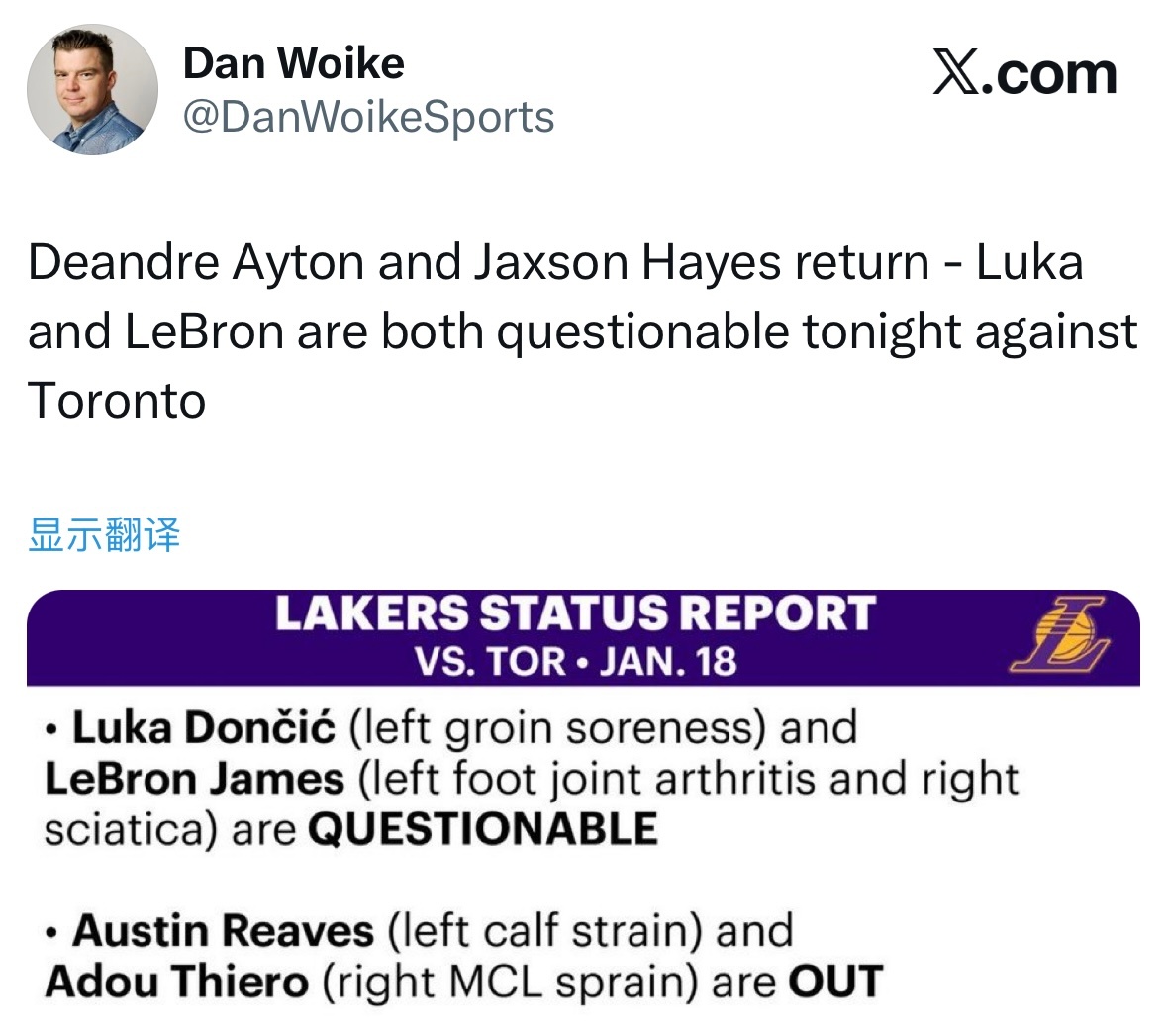 湖人对阵猛龙伤病报告:东契奇(左侧腹股沟酸痛)、詹姆斯(左脚关节炎+右侧坐骨神经
