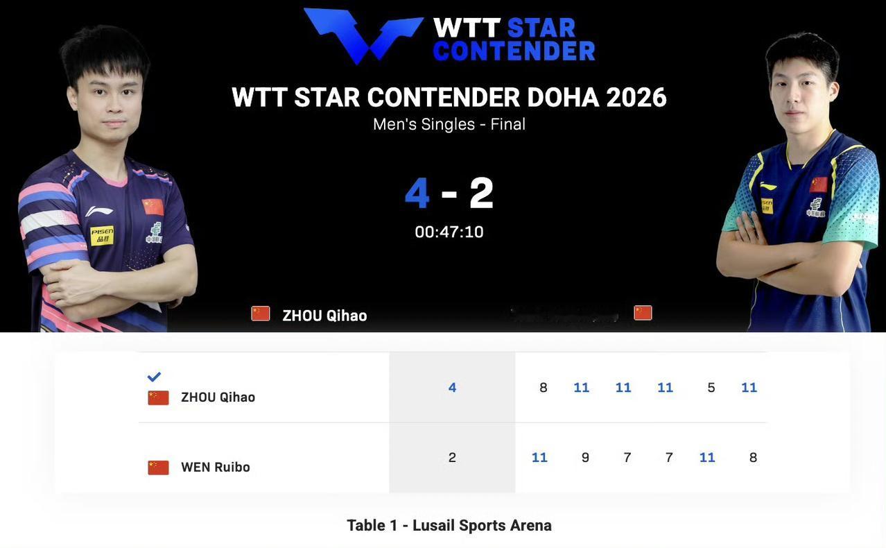周启豪获得男单冠军,温瑞博亚军! 多哈球星挑战赛 结束,男单决赛上演中国德比战,
