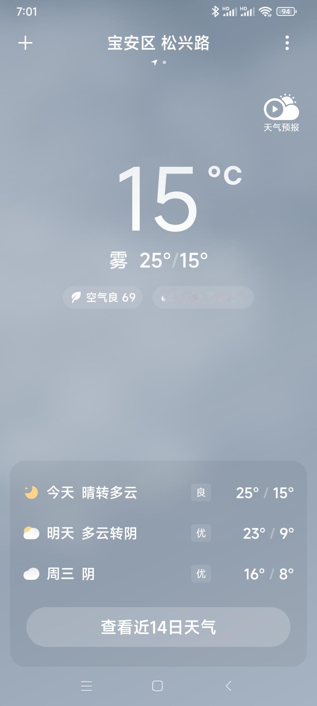 我的今日状态:😁轻松愉快 我这里的天气:☀️晴天今日深圳晴转多云,气温15度到