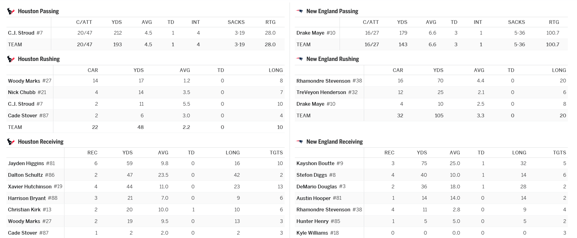 全场比赛,爱国者四分卫德雷克-梅耶送出179码传球,完成3次达阵;三大外接手迪格斯、道格拉斯和布特各完成一次达阵。