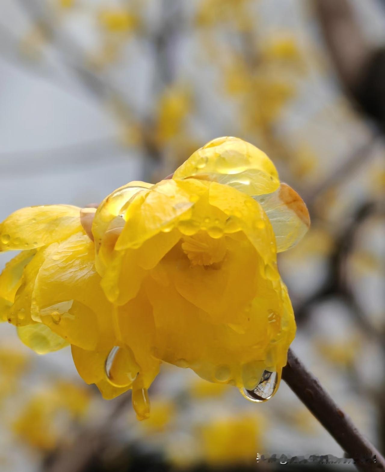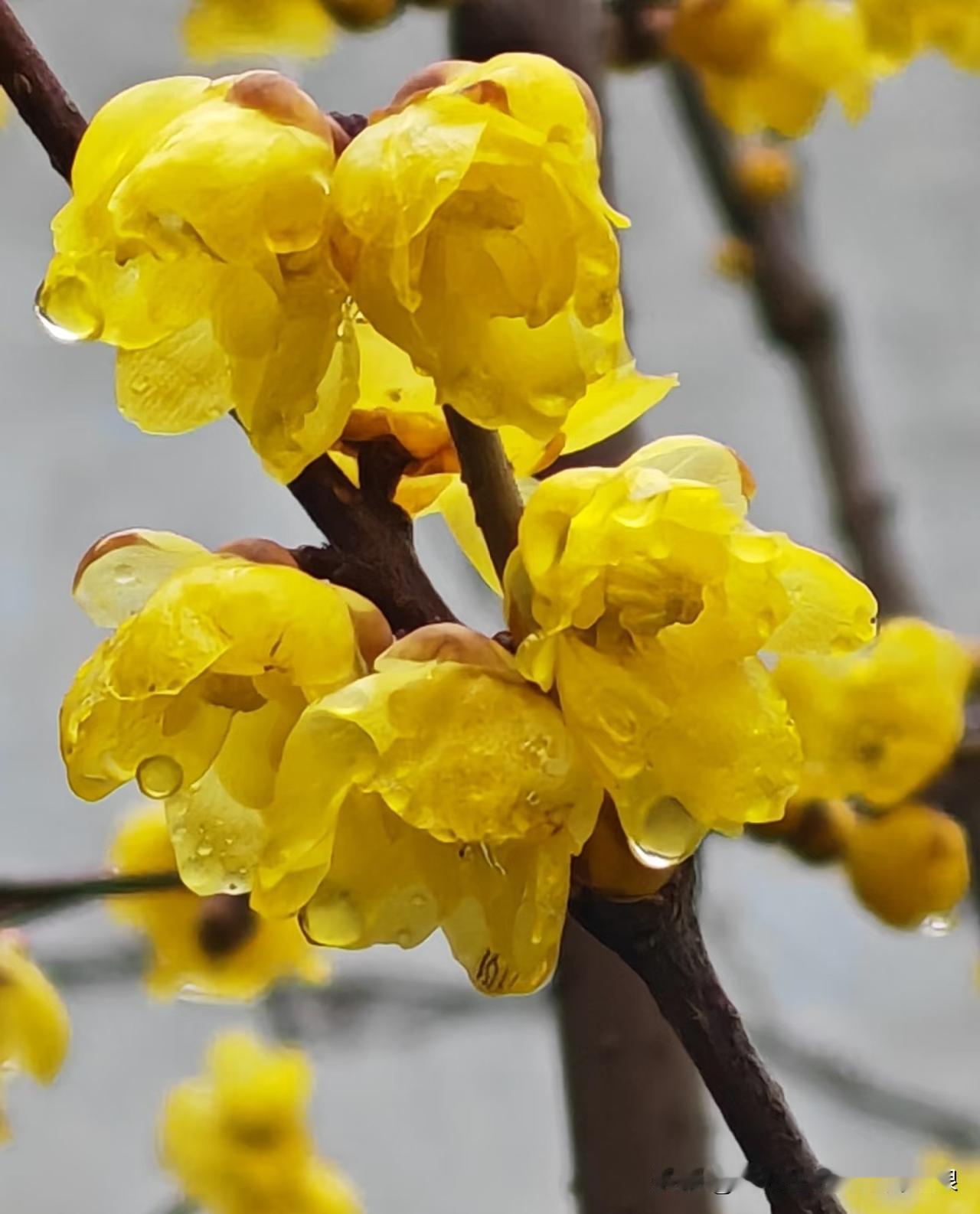 冬雨淅淅沥沥,腊梅反倒开得更精神了。嫩黄的花瓣挂着水珠,像沾了蜜的小灯笼,看着就暖。风一吹,暗香裹着湿意飘过来,清清爽爽的,冬天的冷都被冲淡了。 没想到雨天的腊梅这么耐看!粗糙的枝桠上,一朵朵小花攒着劲儿开,水珠在花瓣上滚来滚去,亮闪闪的。不张扬,却凭着一股韧劲儿,把灰蒙蒙的天衬得都有了颜色。 冷雨里的腊梅才是真好看!没有晴日里的耀眼,却多了份润润的娇憨。花瓣摸起来滑溜溜的,带着雨珠的凉,香气淡淡的,吸一口心里都透亮。原来冬天的美好,藏在这雨打梅花的安静里。 腊梅花 下雨天