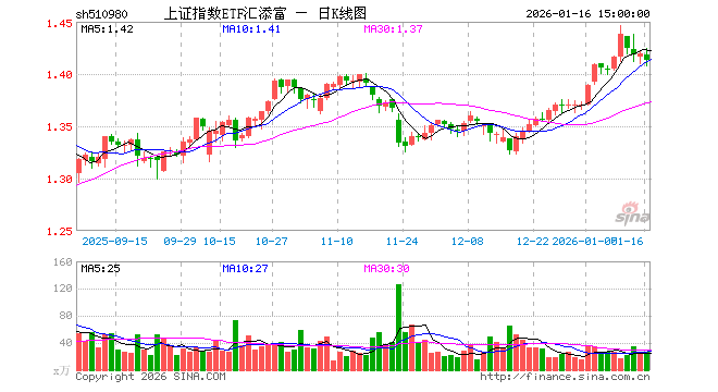 1月16日,上证指数ETF汇添富(510980)跌0.42%,成交额3852.27万元。当日份额增加900.00万份,最新份额为2.55亿份,近20个交易日份额减少1.38亿份。最新资产净值计算值为3.59亿元。