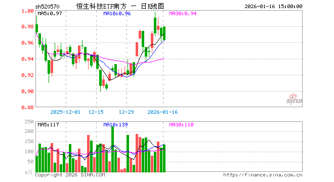 1月16日,恒生科技ETF南方(520570)跌0.52%,成交额1.30亿元。当日份额增加6900.00万份,最新份额为28.14亿份,近20个交易日份额增加12.06亿份。最新资产净值计算值为27.25亿元。
