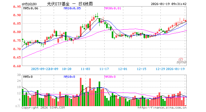 1月19日,光伏ETF基金(516180)开盘跌0.92%,报0.860元。光伏ETF基金(516180)重仓股方面,阳光电源开盘跌0.58%,隆基绿能跌1.76%,特变电工跌1.98%,TCL科技跌0.41%,通威股份跌5.09%,正泰电器跌1.03%,晶盛机电涨4.04%,德业股份涨0.20%,TCL中环涨0.68%,捷佳伟创跌0.90%。