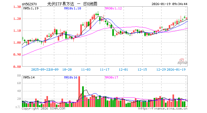 1月19日,光伏ETF易方达(562970)开盘跌0.83%,报1.196元。光伏ETF易方达(562970)重仓股方面,阳光电源开盘跌0.58%,隆基绿能跌1.76%,特变电工跌1.98%,TCL科技跌0.41%,通威股份跌5.09%,正泰电器跌1.03%,晶盛机电涨4.04%,TCL中环涨0.68%,德业股份涨0.20%,捷佳伟创跌0.90%。