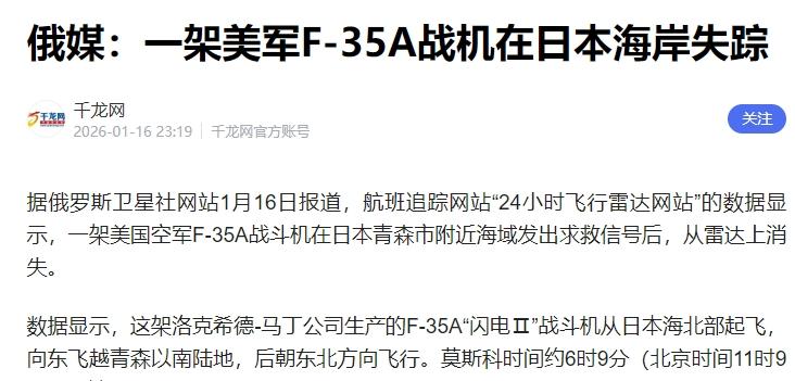 到处耀武扬威的美军,终究被“上天”收拾了! 1月16日上午,一则炸裂消息传来:美国号称“全球最先进”的F-35A隐形战机,在飞往毗邻东海的日本青森附近敏感海域时,突然挂出“7700”紧急代码——这可是意味着“si神叩门”的致命警报啊!可短短10秒后,战机就从雷达上彻底消失,连一句完整的呼救都没留下。 近来东海方向确实不消停,美国一架F-35A战斗机在执行任务的时候,突然就跟断了线的风筝一样,人间蒸发了。 这可不是掉了一架普通飞机那么简单,它直接打乱了美军在整个亚太地区的部署节奏。 他们原本想在日本三泽基地塞进四十八架F-35A,搞一个所谓的西太平洋“隐身空中突袭大队”,现在这计划恐怕得先放一放,好好掂量掂量了。 F-35确实被吹得神乎其神,能隐身,能组网打群架,听着跟科幻片里的未来武器似的,但风光的背后,全是烧钱的窟窿和修不完的毛病。 这飞机特别“金贵”,浑身上下的零件来自世界各地,简直就是个“万国牌”组装货,这就带来一个要命的问题:后勤保障。 想在前线基地备齐所有维修零件?那难度不亚于登天,后勤部门的头都得大三圈,美国自家的审计报告早就把实话给捅出来了: 现在美军的战略就是把“秀肌肉”摆在第一位,用高强度的威慑来弥补内心的焦虑。 从冲绳的嘉手纳基地到东海上四处晃悠的“闪电航母”,F-35的出勤率高得吓人,搞得好像很忙的样子,这种为了威慑而威慑的做法,完全是把保养和后勤这些“里子”问题扔到了一边。 这种高强度的用法,就好比让一个本就体弱多病、需要精心调养的运动员,天天去跑马拉松冲刺,不出事才怪,说到底,是霸权的野心,已经远远超过了它后勤体系的承受能力。 一个本身就有设计缺陷、烧钱又难伺候的武器系统(这是内因),被硬塞进一个只追求威慑效果、不顾客观规律的战略框架里(这是外因),那结果必然是事故频发,可靠性直线下降。 每一次从雷达屏幕上的消失,丢掉的不只是一架价值上亿美元的飞机,更是它背后那个所谓“技术无敌”军事神话的一块砖。 这事儿也给我们提了个醒:现代战争,早就不是看谁的武器参数更亮眼,而是比拼整个国家的工业实力、后勤能力、人才培养和战略定力的综合较量。 把宝全押在一两件所谓的“神兵利器”上,最后这件“神兵”很可能就不是救命的稻草,而是压垮自己的那最后一根。 你认为这到底是技术神话破灭的开始,还是霸权战略走到尽头的又一个信号? 信息来源:千龙网