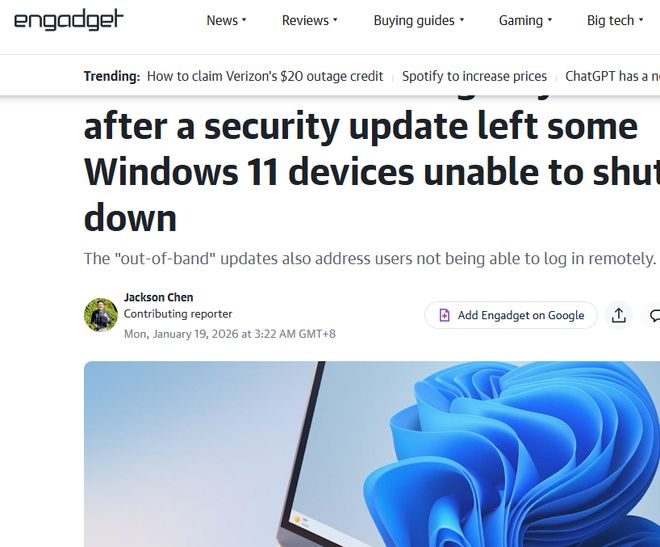 [环球网科技综合报道]1月19日消息,据瘾科技报道,微软针对2026年1月Windows安全更新引发的多项严重漏洞,日前推出了紧急修复程序。此前,部分Windows11设备在安装该安全更新后,出现无法正常关机、休眠的问题,用户执行相关操作时设备仅会重启,同时Windows10与Windows11用户的远程连接登录功能也受到影响。