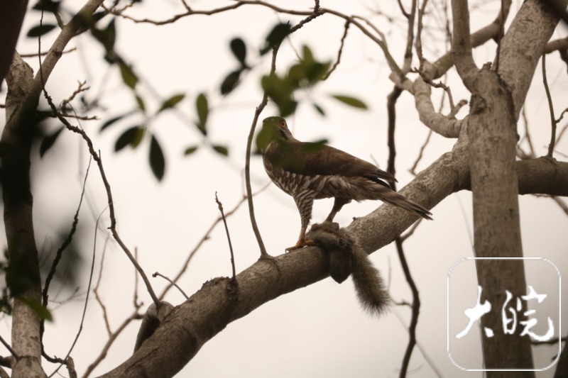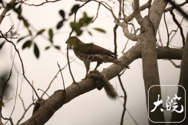 据方向北描述,当天中午他和家长正在植物园观鸟时,忽见地上飞起一只大鸟,飞到树上后才看清是一只体型较大的猛禽,赶紧拍摄下照片,将照片放大后,他发现猛禽用脚抓着一只长着毛茸茸大尾巴的松鼠。