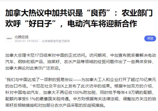 加拿大总理卡尼1月18日发文说:“加拿大有近200万华裔,其中许多人的家人和朋友远在太平洋彼岸。随着我们重振两国关系,中国承诺很快将允许加拿大人免签入境中国。”   卡尼总理这番话,可不是随口一说的客套。这背后是中加关系在经历了一些波折后,正在回归务实轨道的一个清晰信号。   过去五年,特鲁多政府跟着美国对中国电动汽车加征100%关税,以为能讨好邻居。结果呢?中国反手对加拿大油菜籽征收75.8%的反倾销税,萨斯喀彻温省的农民看着仓库里堆成山的油菜籽发愁——这个省80%的油菜籽原本销往中国。   更惨的是美国,特朗普政府一边喊着“盟友”,一边对加拿大钢铁加征25%关税,汽车、木材行业跟着遭殃。2024年,加拿大对美出口占比高达71%,但美国市场的翻脸比翻书还快,让加拿大突然明白:把鸡蛋全放一个篮子里,篮子漏了连补的机会都没有。   卡尼上台后算过一笔账:2024年中加贸易额1174亿加元,中国是加拿大第二大贸易伙伴,仅次于美国。更关键的是,中国市场还在长个子——2025年前八个月,中加贸易逆势增长7.1%。这时候再看特鲁多时期的对抗政策,加拿大等于亲手推开了一个每年能多赚几百亿的市场。阿尔伯塔省的石油公司最有发言权,跨山输油管道扩建后,64%的原油卖给中国,美方眼红想截胡,加拿大只能加快抱紧中国的大腿。   国内的压力也逼着加拿大转身。全加拿大近200万华裔,占总人口5%,温哥华、多伦多的华人社区直接影响着地方选举。特鲁多时期中加关系紧张,华人家庭探亲访友要办签证、等,怨言堆成山。卡尼团队清楚,修复对华关系能稳住这部分选票。更现实的是,加拿大想在2035年前把对美以外出口翻番,亚洲是关键,而中国是亚洲的经济引擎。去年卡尼宣布的“向东看”战略,说白了就是不能吊死在山姆大叔树上。   美国的态度变化也给了加拿大底气。特朗普上台后天天威胁要把加拿大变成“第51州”,2025年美加边境乘用车流量下降20%,边境州的酒店空了,加拿大旅游业损失惨重。这时候德国、法国陆续访华的例子摆在眼前——朔尔茨2022年访华,马克龙2023年带着欧盟官员来谈合作,西方阵营里务实派的声音越来越大。加拿大发现,与其跟着美国玩对抗,不如学欧洲搞平衡,毕竟中国20%的全球经济占比摆在那儿,不合作才是真吃亏。   这次卡尼访华带了农业、能源、贸易部长,摆明了要解决实际问题。电动汽车关税从100%降到6.1%,还给了4.9万辆的配额;中国暂缓对油菜籽的反倾销调查,加拿大猪肉、海鲜也能重新上架。这些数字背后,是萨斯喀彻温省农民的笑脸,是安大略省汽车工人的饭碗。最实在的是免签政策,以后加拿大人来中国旅游、经商不用折腾签证,200万华裔探亲更方便,民间往来热了,政府关系自然稳了。   当然加拿大转身不是没代价。美国盯着呢,特朗普政府嘴上不说,心里肯定不痛快。但卡尼团队算了笔明白账:2025年加拿大对美出口占比已经降到68%,十年后可能跌破60%,而中国市场每多占1%,就是几十亿加元的真金白银。   更重要的是,中加关系破冰让加拿大在西方阵营里有了新角色——不是美国的应声虫,而是能自主决策的经济体。这种转变,从特鲁多时期的“对华强硬”到卡尼的“务实合作”,背后是加拿大被现实逼出来的生存智慧。   现在看,中加关系回暖不是偶然。当美国的保护主义砸了加拿大的饭碗,当中国市场的大门始终敞开,当国内200万华裔的呼声越来越响,加拿大除了转身,没有第二条路。免签政策只是个开始,接下来电动汽车合作、能源管道扩建、农产品关税减免,这些实实在在的利益,才是两国关系重回正轨的压舱石。毕竟在国际政治里,没有永远的朋友,只有算得清的账本和看得见的未来。