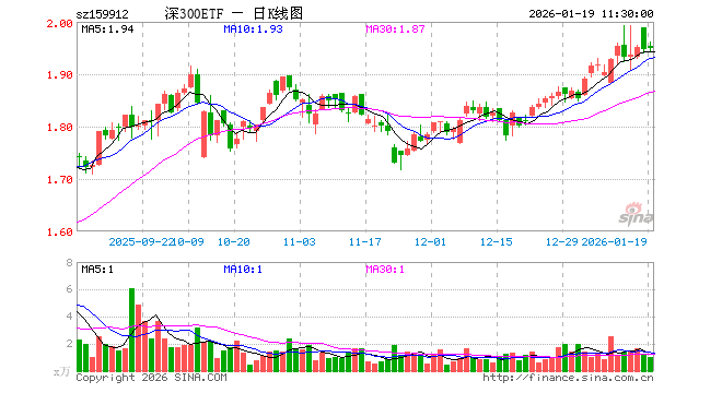1月19日,截止午间收盘,深300ETF汇添富(159912)涨0.10%,报1.948元,成交额199.04万元。深300ETF汇添富(159912)重仓股方面,宁德时代截止午盘跌1.42%,美的集团涨0.06%,中际旭创跌1.78%,东方财富跌1.59%,新易盛涨1.44%,立讯精密涨0.52%,比亚迪涨0.13%,阳光电源跌0.24%,五粮液跌0.54%,胜宏科技跌2.12%。