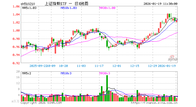 1月19日,截止午间收盘,上证指数ETF(510210)涨0.20%,报1.025元,成交额2.03亿元。上证指数ETF(510210)重仓股方面,农业银行截止午盘跌1.11%,贵州茅台跌0.28%,中国石油涨0.00%,工业富联跌3.43%,恒瑞医药跌1.03%,三一重工跌0.59%,紫金矿业跌0.88%,中国银行跌0.56%,招商银行跌0.21%,邮储银行跌0.19%。