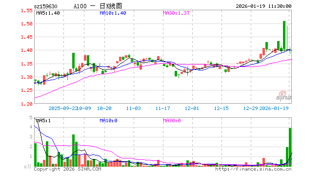 1月19日,截止午间收盘,A100ETF汇添富(159630)跌0.07%,报1.399元,成交额552.40万元。A100ETF汇添富(159630)重仓股方面,宁德时代截止午盘跌1.42%,贵州茅台跌0.28%,中国平安跌0.56%,招商银行跌0.21%,紫金矿业跌0.88%,中际旭创跌1.78%,美的集团涨0.06%,长江电力涨0.83%,兴业银行跌0.15%,立讯精密涨0.52%。