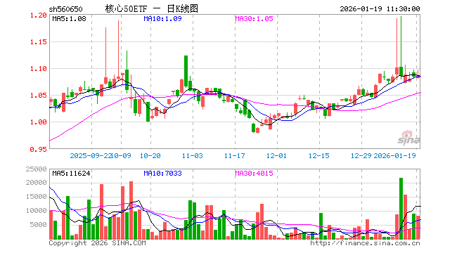 1月19日,截止午间收盘,核心50ETF(560650)涨0.28%,报1.086元,成交额88.57万元。核心50ETF(560650)重仓股方面,东方财富截止午盘跌1.59%,恒瑞医药跌1.03%,阳光电源跌0.24%,迈瑞医疗跌0.22%,豪威集团跌0.89%,万华化学涨4.20%,福耀玻璃跌0.31%,天孚通信跌3.03%,同花顺跌3.72%,思源电气涨5.90%。