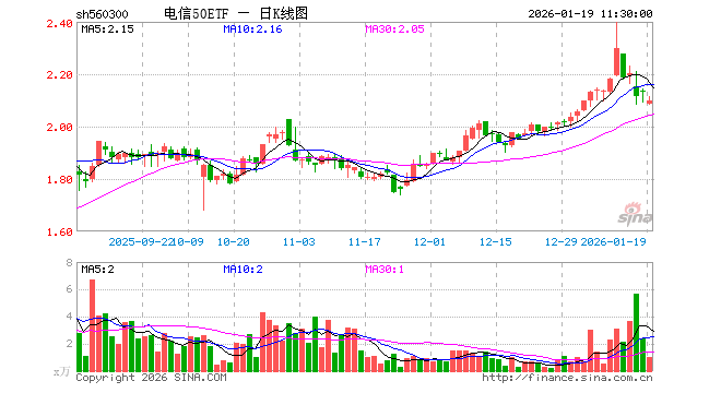 1月19日,截止午间收盘,电信50ETF(560300)跌1.69%,报2.097元,成交额215.45万元。电信50ETF(560300)重仓股方面,新易盛截止午盘涨1.44%,中际旭创跌1.78%,中国联通跌0.39%,中国移动涨0.14%,中国电信涨0.17%,银之杰跌1.36%,中国卫通涨0.77%,中兴通讯跌1.30%,天孚通信跌3.03%,紫光股份涨0.78%。