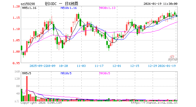 1月19日,截止午间收盘,创业板50ETF大成(159298)跌0.78%,报1.152元,成交额280.84万元。创业板50ETF大成(159298)重仓股方面,宁德时代截止午盘跌1.42%,东方财富跌1.59%,新易盛涨1.44%,中际旭创跌1.78%,胜宏科技跌2.12%,汇川技术跌0.19%,阳光电源跌0.24%,迈瑞医疗跌0.22%,天孚通信跌3.03%,同花顺跌3.72%。