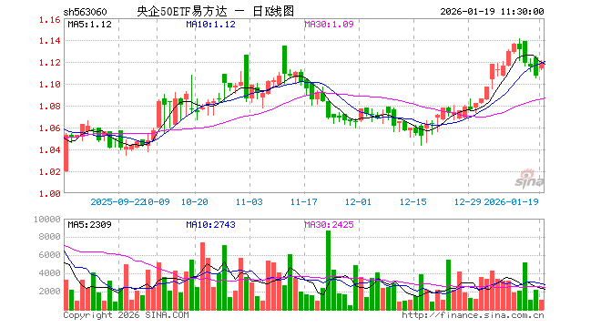 1月19日,截止午间收盘,央企50ETF易方达(563060)涨1.08%,报1.119元,成交额11.35万元。央企50ETF易方达(563060)重仓股方面,长江电力截止午盘涨0.83%,中国神华跌0.76%,海康威视跌0.19%,中国建筑跌0.98%,中国电信涨0.17%,中国移动涨0.14%,国电南瑞涨6.39%,中国石油涨0.00%,中国中车涨0.74%,中远海控跌0.21%。