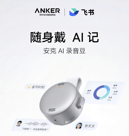 新浪科技讯1月19日上午消息,安克创新与飞书联合发布了最新AI硬件——安克AI录音豆,飞书提供了该产品的软件AI适配与服务。这款产品以极轻的“磁吸纽扣”形态实现无感随身佩戴,基于飞书AI能力,支持声纹识别、实时转写与翻译、实时AI可视化总结以及智能纪要生成,结合飞书知识问答,将录音变成可协同、可流转的知识资产。