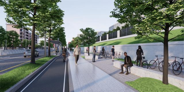 除了已通车的创业路,同属该批改造项目的工业西路(振兴路—湖景大道)升级工程也在稳步推进中。该改造路段全长2387米,道路等级为城市次干路,设计速度40公里每小时,红线宽度30米,双向四车道,改造投资近3900万元,改造主要亮点是对道路铺设沥青,实施“白改黑”,升级原有的公交站台,新建非机动车雨棚和景观坐凳,并新增独立非机动车道。