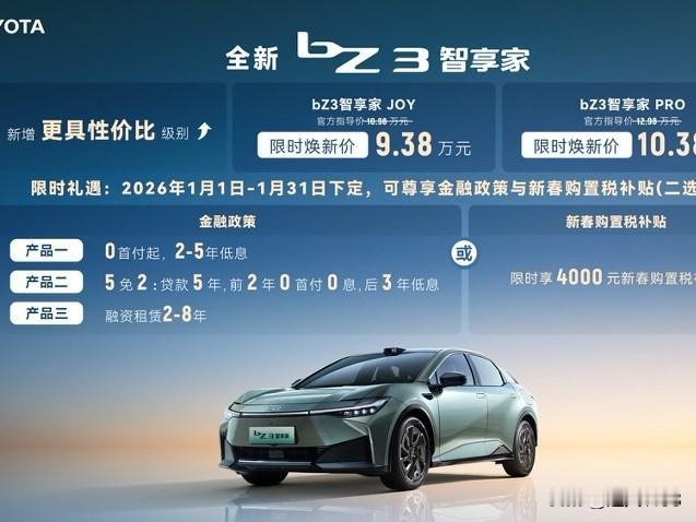 2026年在这新年的第一天,广汽丰田给我们带来了高品质B级的纯电家轿全新bZ3智享家,焕新上市了。仅以现实的换新价9.38万元起,把高品质的B级纯电家轿送到了我们的面前。 丰田bZ3智享家,有着丰田深厚的造车底蕴,尤其是在品质上给我们带来了极高的安全保障。一汽丰田的bZ3智享家,聚焦了“智、享、家”的三大核心理念,把智慧的科技与家庭的温情完美地结合到了一起,给我们诠释了什么是“合家欢”的设计初衷。 丰田bZ3智享家的上市,配备了丰田TSS3.0智行的安全系统,为我们带来了更加智能安全的辅助驾驶体验。这款车仅以9.38万元起的焕新价,给我们带来了新春的特惠。