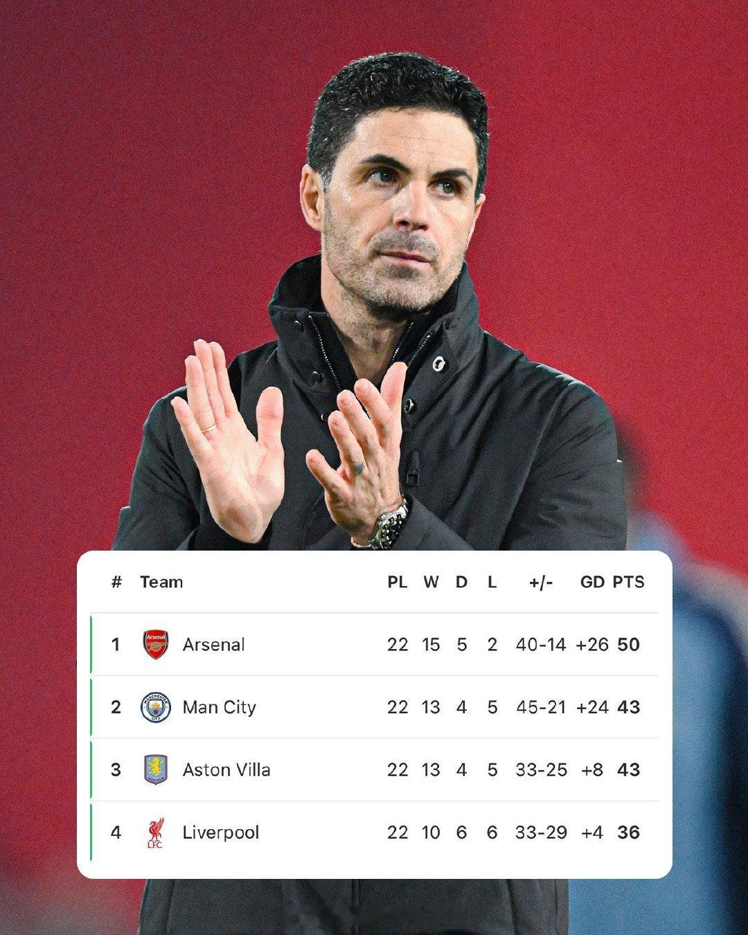 曼城和阿斯顿维拉双双失利,阿森纳在英超积分榜上的领先优势扩大到7分,前四名球队连