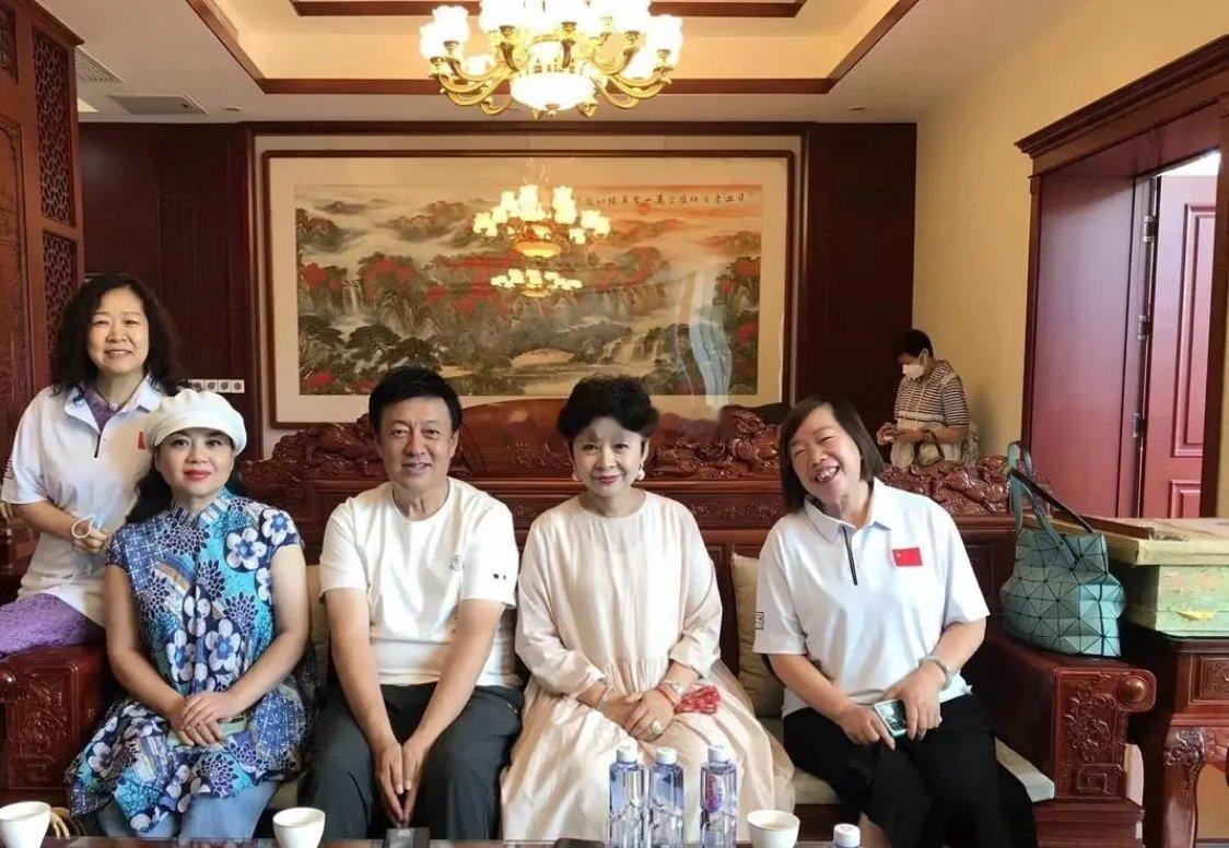 董文华、张也、吕继宏等人在中式风格室内合影,背景有山水画作与雕花木门,氛围庄重典雅。照片中,张也不仅彰显了传统服饰的典雅韵味,更以她那端庄大方的身姿,流露出一种别具一格的高贵气质。