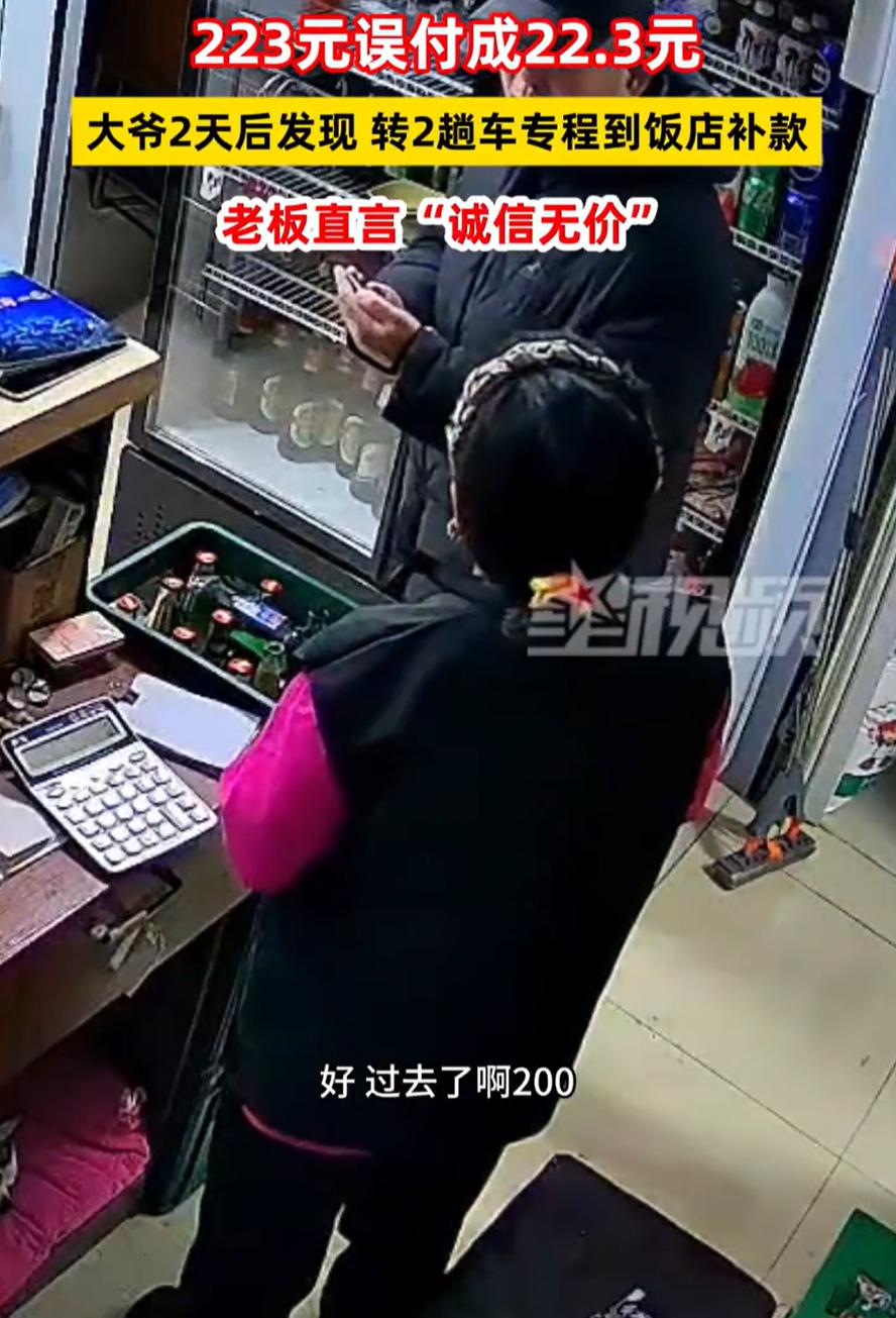 吉林,一位大爷走进小饭店,张口就询问老板在哪,说少发了200块钱,老板娘一听还以为大爷是来找事的,结果一问才知道,是大爷两天前把223元误付成22.3元,他发现后专门赶过来补费用的 原来,两天前,大爷和朋友在这儿吃饭,结账时一共该付223块。他拿出手机扫码,可能手滑了,小数点往前挪了一位,付成了22块3。当时谁也没留意,大爷就走了。老板娘对账时发现了,但觉得人都走了,追也不好追,想想就算了,只当是偶尔运气不好 本以为这个事就这样过去了,老板娘都忘了,没想到,大爷回去后看自己手机的支付记录,越看越不对劲。明明记得吃了两百多,怎么只扣了二十几块?他仔细一想,才反应过来是付错了。于是第二天,他特意转了两趟公交车,专门回到这家小饭店 见到老板娘,大爷掏出手机,一边说那天不好意思付少了,一边当面转了200块钱过去。老板娘都愣了一下,才想起这回事。店里的人后来提起这事,只说了一句:钱不多,但诚信这东西,实在难得 有意思的是,网友算账算得仔细:223减22.3,还差200.7,大爷补了200块,还欠七毛。虽是玩笑,但也让人会心一笑 现在很多人习惯了手机支付,付错钱、转错账的事其实常有。有人装作不知道,有人被提醒了还推三阻四。像这位大爷,自己发现、自己返回、主动补还,说实话,挺让人佩服的 这事儿不大,却挺暖。开小饭店的,常遇到各种顾客,偶尔吃亏也只能往肚子里咽。大爷这一来,不只是还了钱,更像是给这间小店、给看到这事的人,都送来了一点信心。生活中很多小事,其实就是一点将心比心。你体谅我开店不易,我敬重你为人实在,这个理儿,到哪儿都说得通