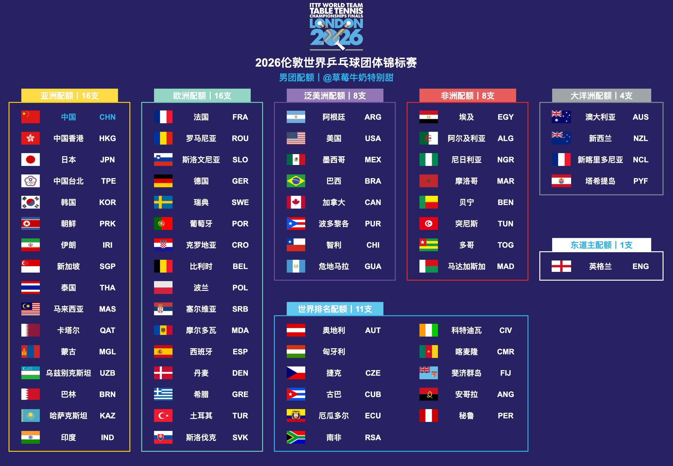 2026伦敦世界乒乓球团体锦标赛丨男女团体参赛配额男女团体各有64支队伍参赛
