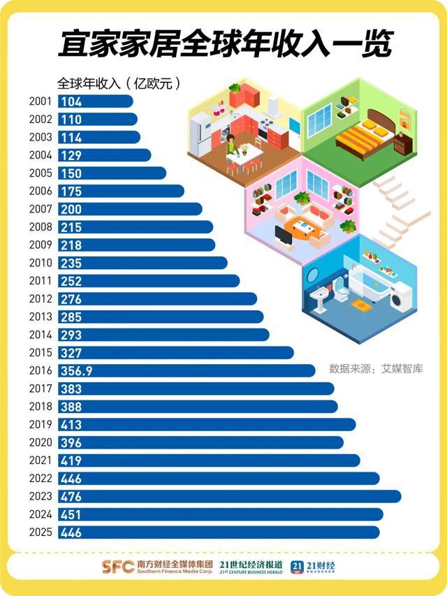 这次调整的背后,是直接的营收压力。2024财年,宜家中国营收111.5亿元,同比下滑7.6%。其母公司英格卡集团2024财年全球营收同比下滑5.5%,2025财年(2024.9.1—2025.8.31)营收进一步同比下降0.9%。