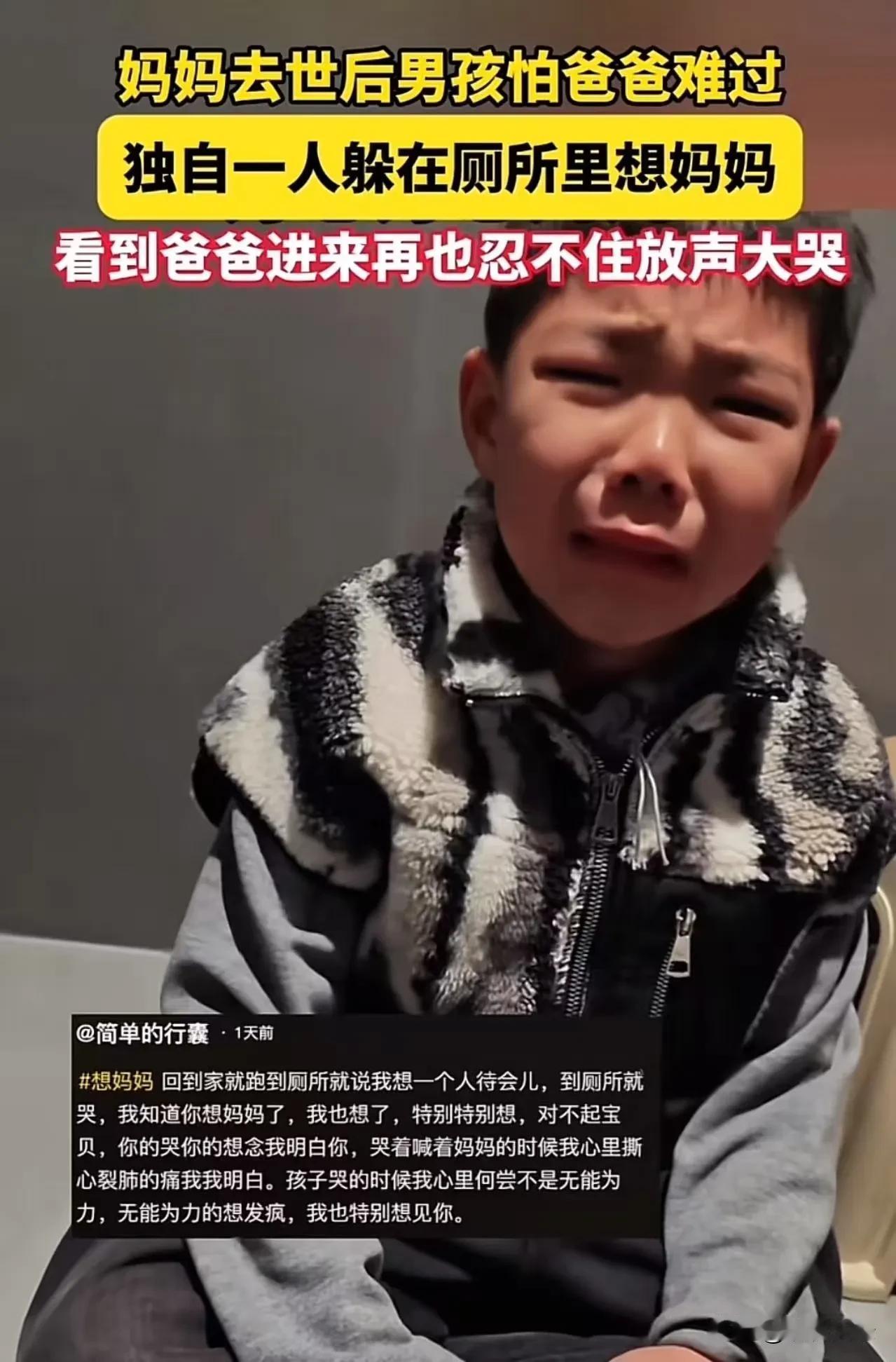 妈妈去世后,男孩怕爸爸难过,独自一人躲在厕所里想妈妈。看到爸爸进来,他再也忍不住放声大哭。那一扇门后,是一个小小的世界,一个属于他自己也属于那个逝去的妈妈的秘密角落。门外,父亲的身影孤独而沉重,他的心仿佛也被那突如其来的失去撕裂得支离破碎。小宇知道,爸爸也在哭,但他不敢让爸爸看到自己的脆弱。6岁的他,用稚嫩的肩膀扛起了成人都难以承受的悲伤。 厕所的角落里,小宇蜷缩成一团,双手紧紧抱着自己瘦小的身体,眼泪像断了线的珠子般不停地滑落。这个年纪的孩子,本该在老师的呵护下天真无邪地玩耍,享受童年的纯粹与快乐,但此刻,他的心早已被阴影笼罩。每一滴泪水,都是对妈妈深深的思念,也是对未来迷茫的恐惧。 他在心里反复问自己:妈妈去了哪里?为什么不再回来?他想象着妈妈温暖的笑容,想象着她轻抚自己头发的手,却只剩下一片空白。那一刻,小宇的心中充满了无助和孤独,他不知道怎样才能让爸爸不要那么难过,也不知道自己是否还能再看到妈妈的笑脸。 突然,门被轻轻推开,爸爸的身影映入眼帘。那一瞬间,小宇再也忍不住了,他的身体开始颤抖,眼泪像决堤的洪水般涌出。他抬起头,看着那个曾经无比坚强、如今满是疲惫的父亲,心中的悲伤终于找到了出口。那一声撕心裂肺的哭喊,仿佛是对失去的妈妈最深沉的告别,也是对自己、对这个世界最真切的控诉。 全网的泪水被瞬间点燃。有人说,这不是坚强,这是孩子在替大人扛悲伤;有人感叹,或许我们都在假装坚强,殊不知,最需要呵护的,往往是那些最脆弱的心灵。小宇的哭泣,是一种无声的呐喊,是对生命的敬畏,也是对爱与失去的深刻理解。 这个故事,让我们看到了人性中最柔软、最真实的一面。或许我们常常把“坚强”挂在嘴边,却忽略了每个坚强背后,都是无数无声的泪水和未曾说出口的痛。孩子的哭泣,提醒我们:不要怕流泪,也不要怕脆弱,因为,只有敢于面对自己的情感,才能真正走出阴影,迎来光明。 在这个快节奏、压力山大的社会里,我们每个人都像那个小宇一样,藏着自己未曾说出口的故事。也许你我都在扮演“坚强”的角色,但别忘了,真正的勇气,是敢于面对自己的脆弱,敢于在需要的时候放声大哭。只有这样,我们才能在风雨中站得更稳,才能在失去中学会珍惜。 所以,亲爱的朋友,当你看到身边那些看似坚不可摧的人,也许他们正用沉默在承受着你看不见的痛。让我们学会善待自己,也善待那些为生活默默挣扎的灵魂。因为,哭泣并不代表软弱,它是我们走向坚强的必经之路。 这份感动,或许会在某个瞬间,成为你我心中最深的共鸣。让我们记住:在悲伤面前,没有人是真正的孤单。只要心中有爱,就没有跨不过去的坎,没有熬不过的黑夜。愿每一个像小宇一样的孩子,都能在爱与被爱中,慢慢长大,学会用最纯粹的方式,去面对这个复杂的世界。爸爸瞬间落泪 妈妈
