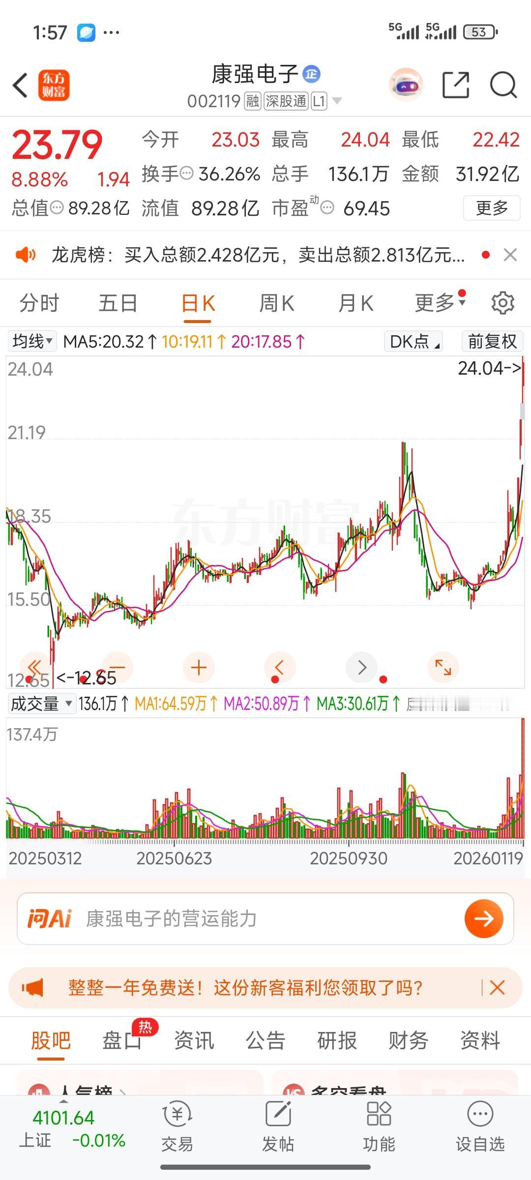 中午复盘时,我发现在自选股里有只好股——康强电子。它在11月和12月挖出了一个超