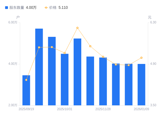 日期A股户数(户)流通A股户均持股数(股)户均持股市值(万元)2026-01-094000746763.4523.902025-12-314007646682.9322.692025-12-194019146549.3622.722025-11-284309143416.6122.322025-11-204356242947.1823.622025-11-105228835780.0121.902025-10-314488441682.2321.972025-10-105310335230.8819.272025-09-305707632778.4917.902025-09-193454054165.0423.62