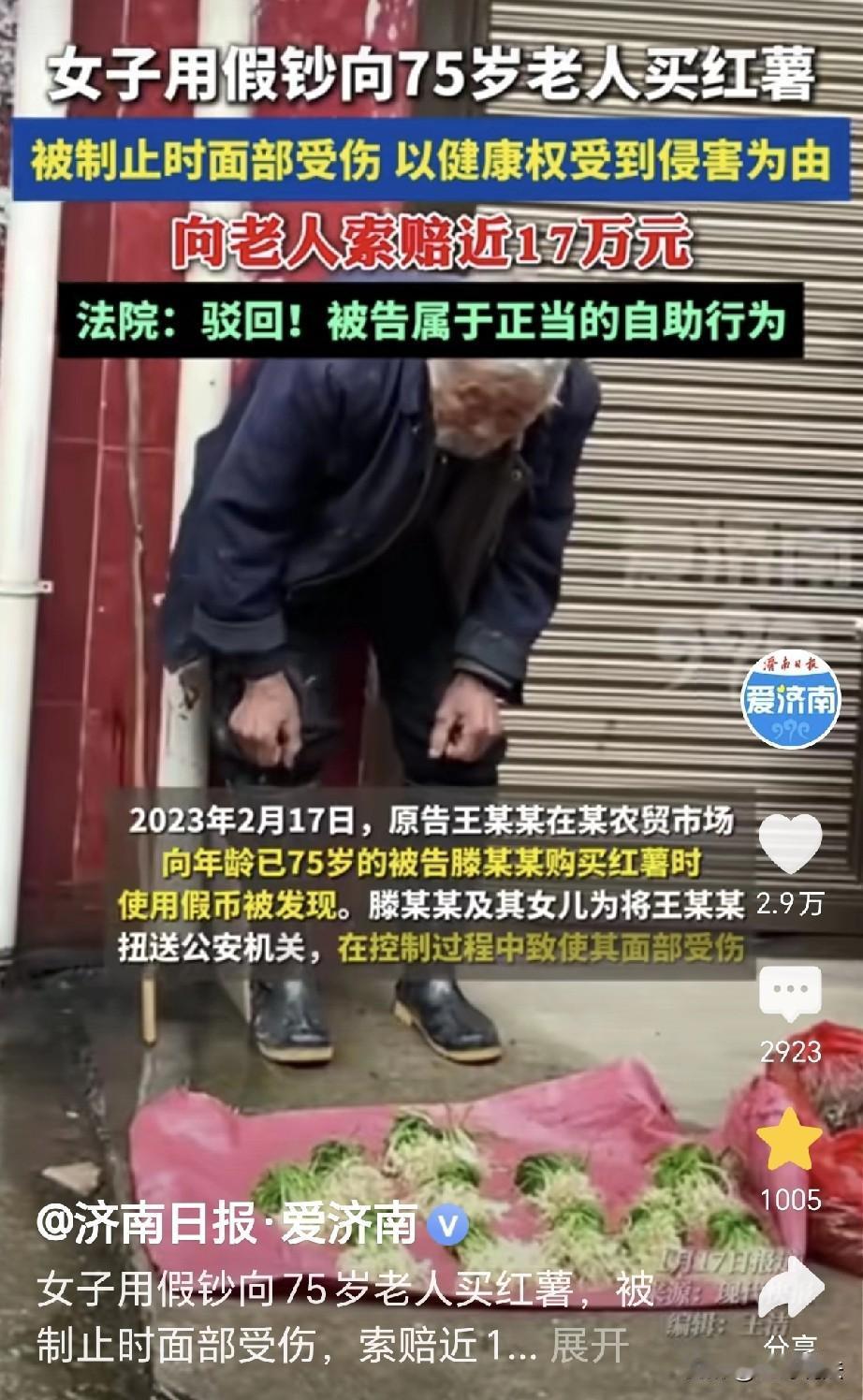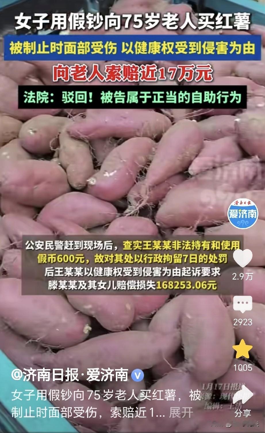 法不能向不法让步!南京,一75岁大爷在农贸市场卖红薯,一女子看大爷老实好欺负,她买了几颗,结账时给大爷一张假钞,大爷发现后叫来女儿,俩人拉住女子要送她到派出所,女子拼命挣扎,不小心脸部受伤,警方赶到,发现女子非法持有和使用假钞600元,女子被拘留7天,出来后不肯善罢甘休,她以健康权受到侵害为由,将大爷父女告上法院,索赔168253.06元,法院判了! 农贸市场里人来人往,各种摊位上摆满了商品,这些商品都是蔬菜瓜果,叫卖声,讨价还价声响成一片。 2023年2月17日这天,滕大爷和往常一样,他起了个大早,背着一袋子红薯,早早的来到了农贸市场。 他找到一个摊位,把自己种的红薯,整整齐齐的摆成了一堆。 他带了个马扎,随手就坐在了后面,看着市场里人来人往,他就想今天的红薯能够卖出个好价。 这红薯是他自己种的,他的红薯又大又甜,藤大爷要的价格不高,不大一会,就卖出去了不少。 滕大爷满心欢喜,他颤颤巍巍,小心翼翼,一张一张数着手里那几张刚收到的零钱。 这时,女子王某某来到农贸市场,她东看西看,一眼就看到了藤大爷的红薯。 她爱吃红薯,红薯营养丰富,尤其是这种农民自己家种的红薯,健康食品,对美容养颜很有帮助。 王某某看完了红薯,又抬眼朝腾大爷看去,腾爷爷一脸忠厚,他饱经风霜,一双手满是种地的茧子。 王某某顿时有了个主意,这个卖家一定没见过世面,就是一个憨憨的农民老头! 她拿定了主意,立刻走到滕大爷的摊位前,她左挑右选,最后挑了几个很大的红薯。 红薯称好,花不了几个零钱,可是王某某却从包里掏出了一张百元大钞。 她把钱递给滕大爷,滕大爷接过了钱,可是他年纪大了,眼神不好。 腾爷爷仔细地摸了摸那张百元大钞,又对着阳光看了看里面的纹路。 腾爷爷起了疑心,他只是年纪大了,他又不傻,虽然没见过假钱,但是真钱他也见过不少。 眼看这张钱手感不对,纸张僵硬削薄,他透着光亮,那纸币上的图案也显得很不真实。 腾爷爷拿不定主意,可又怕冤枉了人家,他把这张钱递给了旁边的女儿。 女儿一眼就看出钱是假的,她非常生气,你这人怎么能用假钱呢?太不地道! 王某某瞬间变脸,她慌乱之间想要夺回假钞,滕大爷急了,和女儿抓住她不放。 王某某拼命挣扎,她用力想甩开滕大爷女儿的手。 周围的群众看到,纷纷围过来指责王某某,有人说道,用假钱骗老人,太不地道! 腾大爷拉住王某某不放,非要送她去派出所。 王某某见势不好,更加疯狂地挣扎起来, 谁知双方拉扯,王某某脸部被抓伤了。 这个时候,民警赶到现场,经过查实,王某某非法持有和使用假币600元。 警方对王某某给予了处罚,拘留7日,本以为这件事就这么结束了,可没想到,王某恨得咬牙切齿,认为都是被藤大爷害的。 她照着镜子,看到脸上的伤痕,她以健康权受到侵害为由,一纸诉状将滕大爷父女告上了法庭,索赔168253.06元。 滕大爷收到传票,不敢相信自己的眼睛,他十分委屈,我辛辛苦苦卖点红薯,赚的都是一些零钱。 她用假钱骗我,我只是想抓住她,让她受到惩罚,怎么就成了我伤害她了? 有人认为,王某某使用假币坑害老人,不仅行为恶劣,良知泯灭,更是在犯法犯罪,可她却不思悔改,反过来起诉老人,真的是为了钱脸都不要了。 滕大爷父女制止她的行为是正义之举,不应该承担赔偿责任。 如果因为王某某受伤就让她得到赔偿,那以后谁还敢制止违法犯罪行为呢? 那么,这件事在法律上是怎么认定的呢? 法院认为,法不能向不法让步,滕大爷父女的行为属于正当的自助行为。 《民法典》第1177条规定: 合法权益受到侵害,情况紧迫且不能及时获得guo家机关保护,不立即采取措施将使其合法权益受到难以弥补的损害的,受害人可以在保护自己合法权益的必要范围内采取扣留侵权人的财物等合理措施。 王某某用假币购买红薯,侵害滕大爷的财产权,属于不法行为。 王某某被识破后当场试图逃跑,若不及时控制,将导致无法追责、假币无法追回,属难以弥补的损害。 滕大爷父女仅实施控制人身自由的行为,目的是扭送派出所,未使用器械或实施殴打等过度行为,符合必要范围。 因此,法院认为,滕大爷父女的行为构成合法自助行为,无需承担侵权赔偿责任。 《刑法》第172条:明知是伪造的货币而持有、使用,数额较大的,处三年以下有期徒刑或者拘役,并处或者单处一万元以上十万元以下罚金。 王某某明知是假币仍用于交易,且持有600元假币,存在主观故意。 ​ ​但王某某持有使用假币600元,未达“数额较大”(通常4000元以上)的入罪标准,因此警方给予行政拘留7日的行政处罚,处理适当 。 ​ 王某某脸部受伤,是因为她的不法行为在先,这才引发了后续的受伤,王某某自身存在重大过错,后果应当自行承担。 最终,法院驳回了王某某的诉讼。 对此,你怎么看?欢迎评论区留言讨论。
