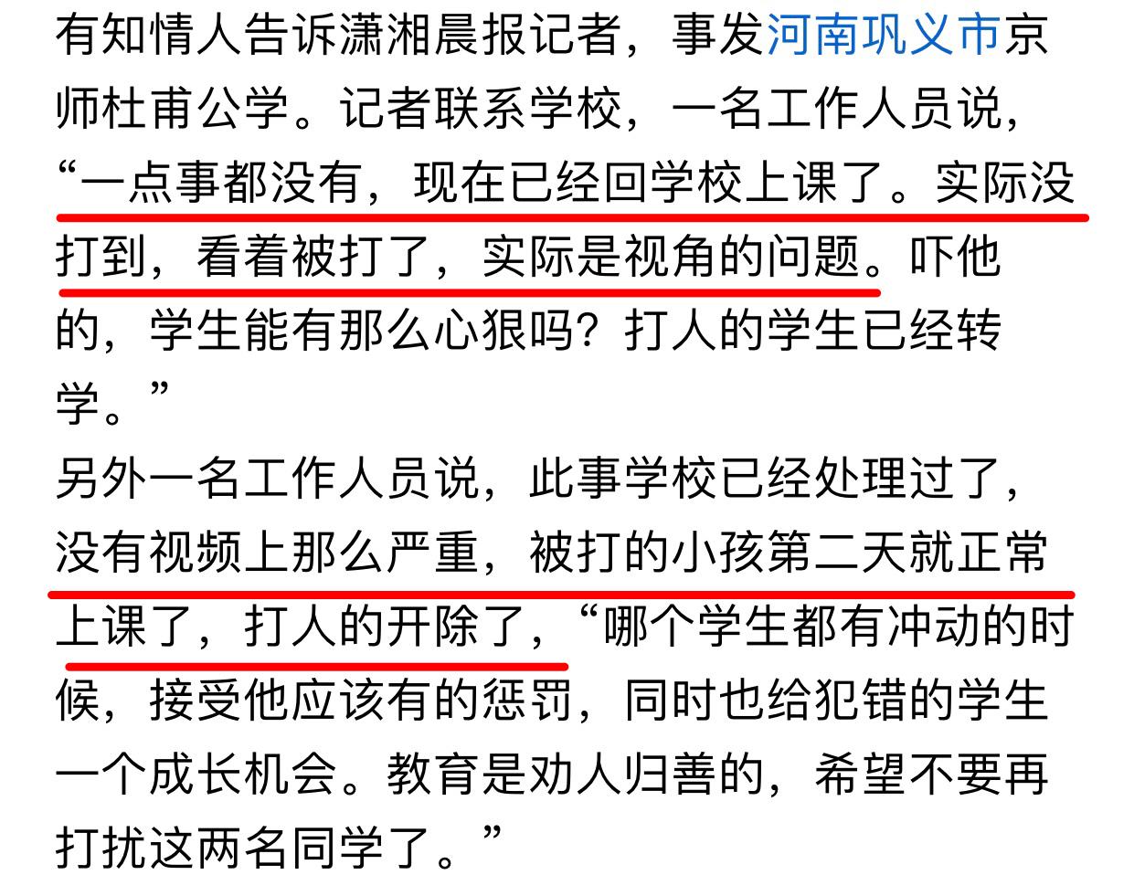 学校监控中:拿着凳子抡圆砸同学后脑 学校回复里:一点事儿没有,没打到不严重 河南这所学校的说明不能说漏洞百出只能说糊弄都懒得糊弄,前面说压根没打到是视角问题,后面就讲被打者不严重打人者已被开除,明显是口风都没对好就出来回应。视频里完整地记录了打人者站起来到拿凳子砸同学再到回座位的过程,可能在学校看来大事化了不影响声誉才是重点。