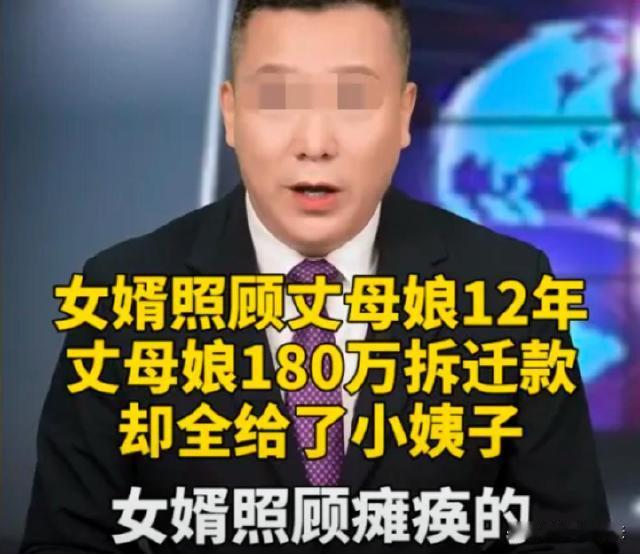 江苏盐城。外人终归是外人?一男子妻子去世后,他精心伺候瘫痪丈母娘12年,老人家的房子拆迁了,180万拆迁款却一分钱不给男子,全都给了小姨子。不仅如此,还被这家没良心的人给赶出了家门。狠心的小姨子拿了钱,又不肯照顾瘫痪的母亲,又找到男子,想要让他来帮忙照看。男子说:分我90万拆迁款再说! 本新闻来源:资讯午高峰 据报道称,男子提出,想要自己回来照看老娘也可以,分自己90万拆迁款,另外还要支付护工费、护理费。听到这个诉求,小姨子直接就拒绝了。 这位老人家偏心偏的,又要女婿来照顾自己,又不肯支付一分钱,拆迁款甚至一分钱不给他。最后,瘫痪在床、无人照料。女婿表示:就让她自己反省去吧。 张先生是一个老实人,本来跟妻子的小日子过的还算安稳,但是妻子却命不好,患上了重病。 就在妻子快要去世的时候,她反复叮嘱,希望丈夫能够好好服侍自己的丈母娘,因为她的妹妹(就是丈夫的小姨子)人不靠谱,只能依赖他了。 面对妻子的嘱托,张先生知道,自己的妻子最放心不下的就是瘫痪在床的老母亲。老实本分的张先生则一口答应了下来。 妻子去世之后,张先生果真履行了承诺,对丈母娘那可真是尽心尽责。 而妻子的妹妹,就是他的小姨子,一直就在外地,偶尔才回来看一下老娘。 端水伺候、擦肩搓背,就这样,张先生服侍自己的丈母娘,一晃就12年过去了。他丝毫就没有怠慢过自己的丈母娘,作为女婿,做到这个份上,真的是太良心了。 而老太太怎么做的呢,因为张先生就是个外人,她时刻都防着他呢! 因为,在老太太的眼里,张先生始终就是个外人,女婿嘛,真心不真心的,说不定就是为了钱呢。 没多久,老太太老宅的房子拆迁了,张先生还帮忙办理了相关手续,当时拿到了180万元的拆迁款。 可是,就当老太太把180万全都拿到手之后,她可真的是一分钱都没有留给女婿,转身全都给了小女儿。 张先生得知之后,特别心寒:这偏心,可真的是偏到哪里去了?自己辛苦照顾她12年,没有功劳也得有苦劳吧?十万二十万的,一分钱不给? 跟老太太说了一下,谁知道老太太一点不站他,还时不时排挤他。最后,张先生无奈,只能选择离开。 张先生离开之后,岳母就没了依靠,连饭都吃不上了,饿的都快脱水了。幸亏邻居过来串门,赶紧打电话给了小女儿。 小女儿回来之后,看到老娘瘫痪在床,自己满脸嫌弃,也伸不出手去照顾。不情不愿的服侍了两天,小女儿立刻给姐夫打去电话。 “伺候这么久,咋不伺候了啊?我哪有时间照顾,我还要上班。”这个小姨子,上来就开始教训自己的姐夫。 而张先生则表示:“拆迁款是你拿的、母亲是你的,你不应该照顾吗?” 小女儿还很凶恶:“没钱你就不管了吗?” 张先生一听这话,表示:“要我管可以,拆迁款给我90万,另外,护理费按照市场价给我。” 小姨子直接拒绝。听到拒绝,张先生立刻就挂断电话,心想,“以后你家的事情,我一概不管。老太太,你就自己反省去吧,12年,我也对得起你了。” 本案释法:那么,从法律的角度来说,张先生作为女婿,是否有义务照顾瘫痪的岳母呢? 根据《民典法》第1067条规定,成年子女对于自己父母享有赡养权,而女婿、儿媳对于配偶的父母则没有法定的赡养义务。 如果成年子女不履行赡养义务的,缺乏劳动能力或者生活困难的父母,则有权要求成年子女支付赡养费。 这里所说的“子女”,包含了婚生子女、非婚生子女、养子女以及有抚养义务的继子女,但是并不包含女婿或者儿媳妇。 因此,从法律规定可知,张先生不需要承担照顾瘫痪在床的岳母,因为他不具备法律责任。 但是,如果作为女婿,张先生自愿承担,法律是支持的,对于他的行为也会予以肯定,此举涉及到道德跟家庭和谐方面,从这些层面来说值得点赞。 换做是你,站在老张的角度,是否还会继续履行妻子的承诺、继续照顾瘫痪的岳母呢? 欢迎大家前往评论区一起来讨论吧!