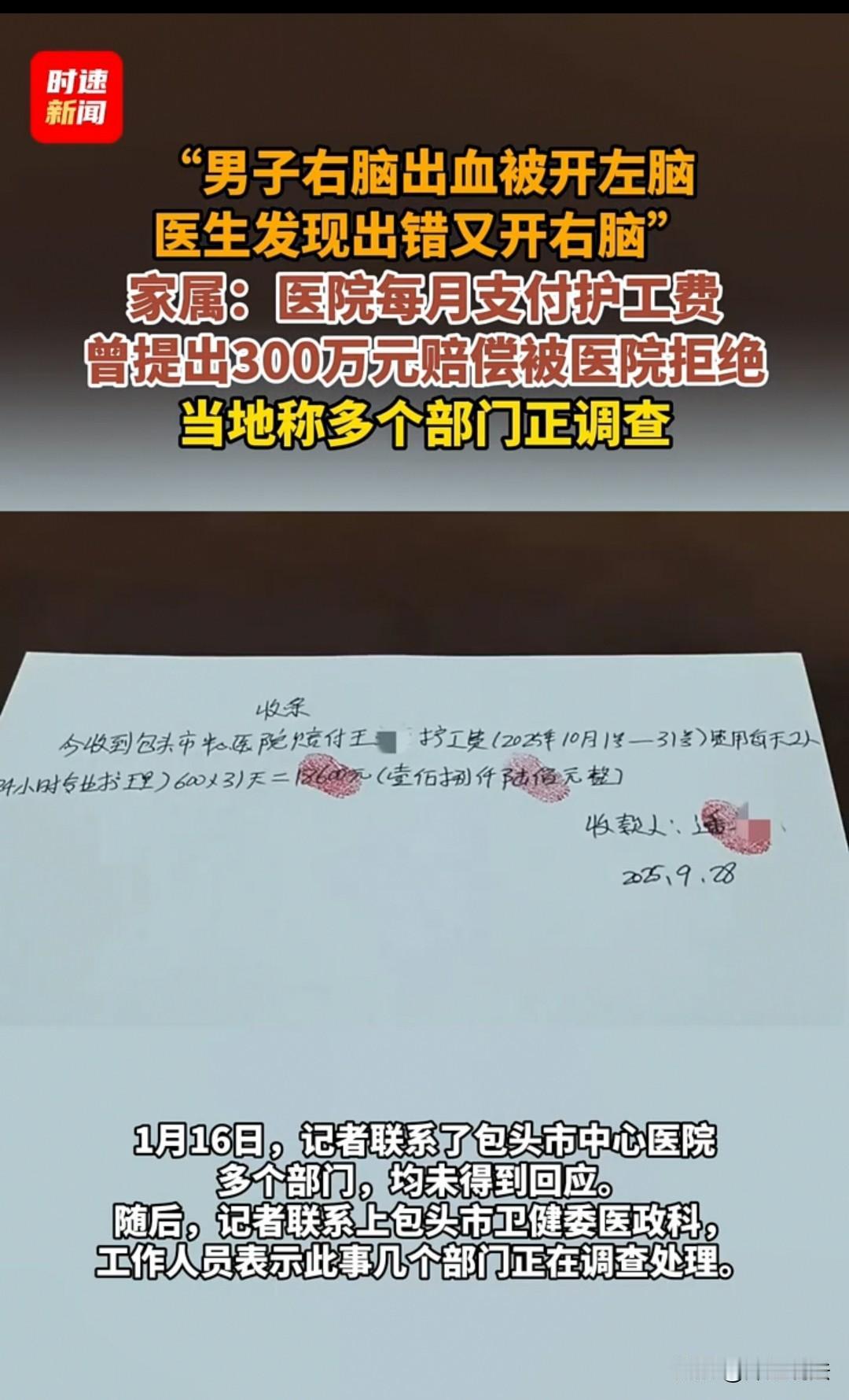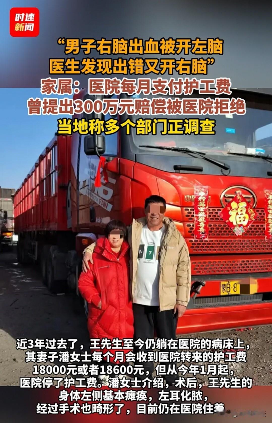 包头,男子在家摔了一跤,查出右脑出血,医生却开了左脑手术,他妻子瞥见伤口,当时就急得直跺脚,赶紧找医生说搞错了,医生才又给右脑补做了手术,现在男子左边身子没知觉,天天躺医院,连话都说不清,一开始医院每月给1.8万护工费,现在不仅停了钱,还催家属赶紧处理,家属要300万赔偿,医院说太多批不下来,事儿拖了好久,一直没个准信,他妻子白天守病床,喂饭擦身,夜里蜷在折叠椅上,根本睡不好,跑医院、找部门申诉,腿都跑细了,看着丈夫遭罪,自己却没辙,心里像堵着块石头,急得满嘴起泡,好好的家散了大半,她快撑不住了。 包头的潘女士,这三年的生活,是从丈夫的两次开颅手术开始变样的。 2023年大年初十,她攥着丈夫老王的手进了医院——老王在家摔跤后查出右脑出血,医生说“手术能救”,她悬着的心刚落了半分。 可术后没几天,她盯着丈夫头上的疤愣了:明明说开右脑,怎么左边也有缝合的痕迹? 追问才知道,医生把“右”当成了“左”,开错左脑后又补开了右脑,丈夫的头被生生开了两次。 那时候潘女士在医院走廊蹲了半宿,眼泪把口罩浸得透湿。 之前丈夫是开大车的,一米八的个子,扛几十斤货上下车都轻松,家里那辆贴着“福”字的红卡车,是他们攒了大半辈子的底气。 可现在,丈夫躺在病床上,左侧身体动不了,左耳化脓到变形,连说话都含糊不清。 这三年是真的熬。潘女士每天天不亮就往医院跑,擦身、喂饭、盯吊瓶,夜里蜷在病房的折叠椅上睡,早上起来后背都是僵的。 她不敢跟七十多的公婆说实话,只说“恢复得慢”,挂了电话手都在抖——丈夫是家里的顶梁柱,如今成了24小时离不开人的病人,孩子还在上学,全家的开销像块石头压得她喘不过气。 医院起初每月给1万8的护工费,是她仅有的“喘口气”的机会:请个白天的护工,自己能抽空回趟家洗件衣服。 可今年1月,这笔钱突然停了。 她跑去找医院,科室推给行政,行政只说“等调查”,绕了一圈,只等来一句“再等等”。 去年11月,律师帮她算过账:后续康复、护理、丈夫的误工损失加起来,300万都是往少了算。 她攥着赔偿清单找医院,得到的回复是“金额太高,没法批”。 走出医院大门,冷风裹着雪砸在脸上,她蹲在路边哭了——不是心疼钱,是心疼丈夫头上那两道歪疤,心疼这三年里丈夫夜里喊疼的每一声。 现在她的包里,永远装着三样东西:丈夫的病历、护工费收据、写满诉求的投诉信。 往卫健委跑了一趟又一趟,鞋跟磨平了,嘴皮说破了,她要的不是300万,是“一个说法”——想让丈夫遭的罪没白受,想让那开错刀的失误,能被实实在在地“认下来”。 前几天她给丈夫擦手,丈夫突然攥住她的手腕,含糊地说“回家”。 她背过身抹了把泪,笑着转过来:“快了,等事儿解决咱就回家。” 可她心里清楚,“回家”早不是从前的样子了:红卡车落了灰,沙发蒙着布,丈夫再也不能扛着货笑哈哈地进门。 但她还是得熬:熬到调查有结果,熬到赔偿落了地,熬到丈夫能坐在自家院子里,晒上哪怕十分钟的太阳。 这三年,她没睡过整觉,没穿过干净衣服,可总说“不能垮”——她是丈夫的手和脚,是这个家剩下的那根梁。 只是偶尔夜里,盯着丈夫头上的疤,她会忍不住想:要是那天手术没开错,现在的日子,会不会不一样? 《民法典》第一千二百一十八条和第一千二百二十一条说得很清楚,患者诊疗中受损害,医疗机构或医务人员有过错,就得承担赔偿责任,医务人员没尽到相应诊疗义务造成损害,医院也得担责。 医生把右脑手术开成左脑,明显是重大诊疗过错,和患者左边没知觉、长期卧床的损害直接相关,医院肯定跑不了责任。 之前医院给护工费,其实就是默认了自身责任,现在突然停费还催处理,完全不符合规定。 家属要300万赔偿,也不是瞎要,按《关于审理医疗损害责任纠纷案件适用法律若干问题的解释》,得结合医疗费、后续康复费、护理费、误工费等实际损失算。 根据《医疗纠纷预防和处理条例》,家属可以先跟医院协商,谈不拢就找卫健委申请行政调解,或者直接起诉。 关键是把病历、护工费收据、沟通记录这些证据留好,法律会给受害者撑腰,不用怕医院拖着不处理。 对于此事,大家怎么看? 素材来源于红星新闻2025.1.19