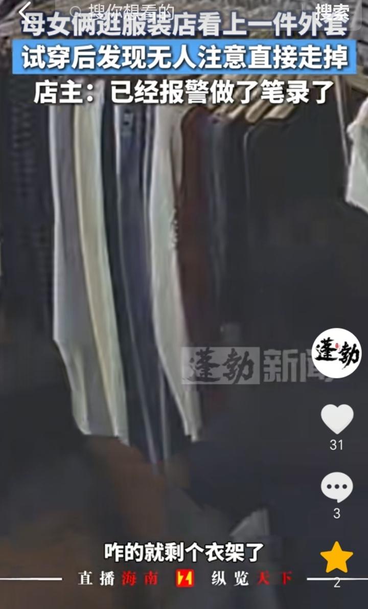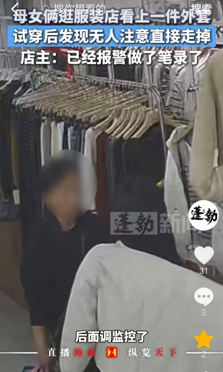 “能心安吗?”山西太原,母女俩逛服装店,看上了一件外套试穿了一下觉得挺合适,然后看四下无人直接穿着衣服就走了,也没有付钱,店主去拿衣架的时候才发现只剩衣架,衣服没有了,店里找也没有找到,后来调取监控发现母女俩把衣服给穿走了。店主表示,目前已经报警做了笔录。 既然看上衣服了,要买就需要付钱,如果嫌贵可以让打折都行,结果不付钱,看四下无人直接拿走了,她俩还以为自己做的没人知道,殊不知监控已经拍摄了下来,再者,她俩这以非法占有为目的,可能已经构成盗窃罪了。 真不知道没有付钱的衣服,就给人家直接穿走了,难道能心安吗? 做人还是要本分,千万不要心存侥幸,有时候往往就是这种侥幸心理害人害己。 既然店主已经报警,那么就希望警方尽快找到这对母女,然后对其严惩,以免类似情况再次发生。
