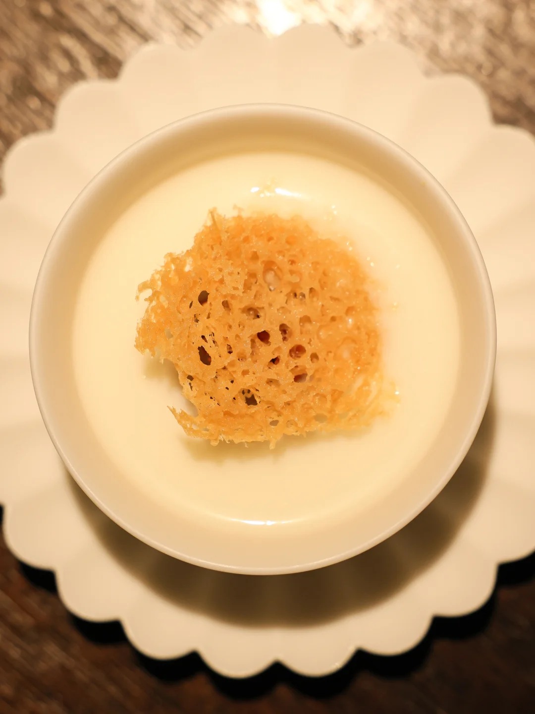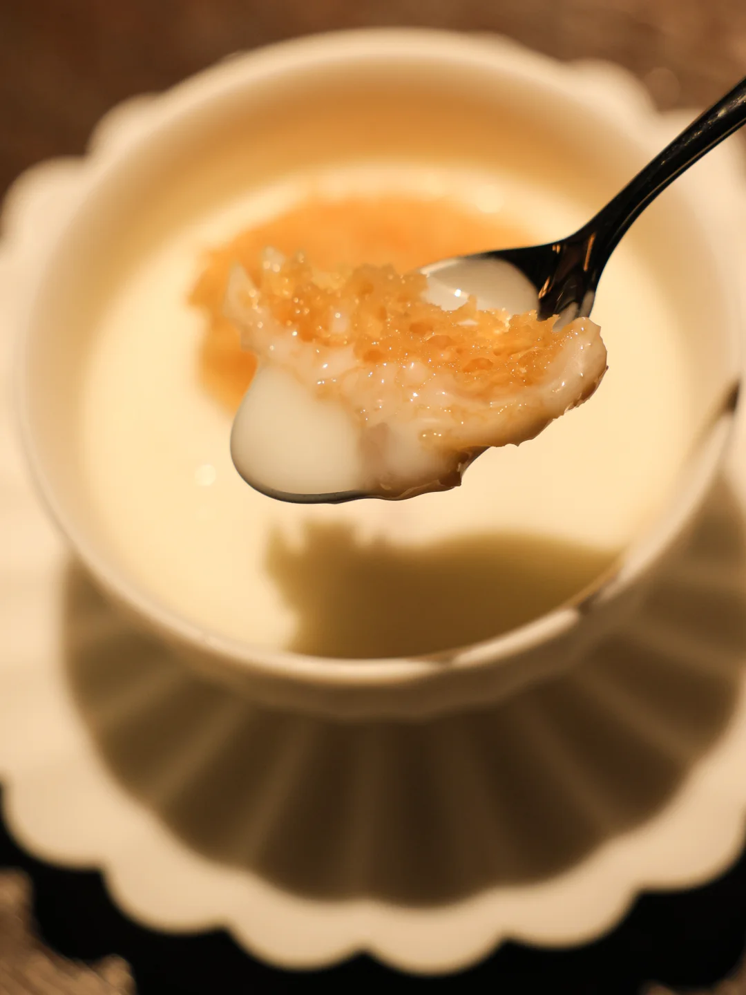 这道甜品就像是将一些奶茶小料做到极致浓缩的精品体现:香气十足的芋头混合麻薯,再叠加桂花的香气以及酥皮的口感加持,想想就不会难吃的一款偏甜的甜品。
