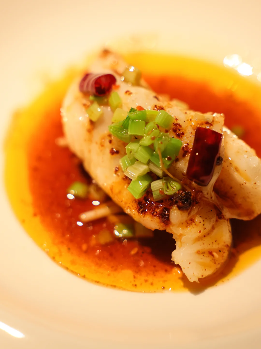 这一道菜是朋友极力推荐的新菜,本以为斑鱼无非就是蒸一蒸,吃点鲜甜的口感了,没想到还是在遇外滩的调味上玩出了新花样:永泰茶油给整体增添一份淡淡的茶香味,而酱汁底下又舍得点缀一些干辣椒的辣意。吃肉的时候能感受到油淋过后被高温激发出来的香气。