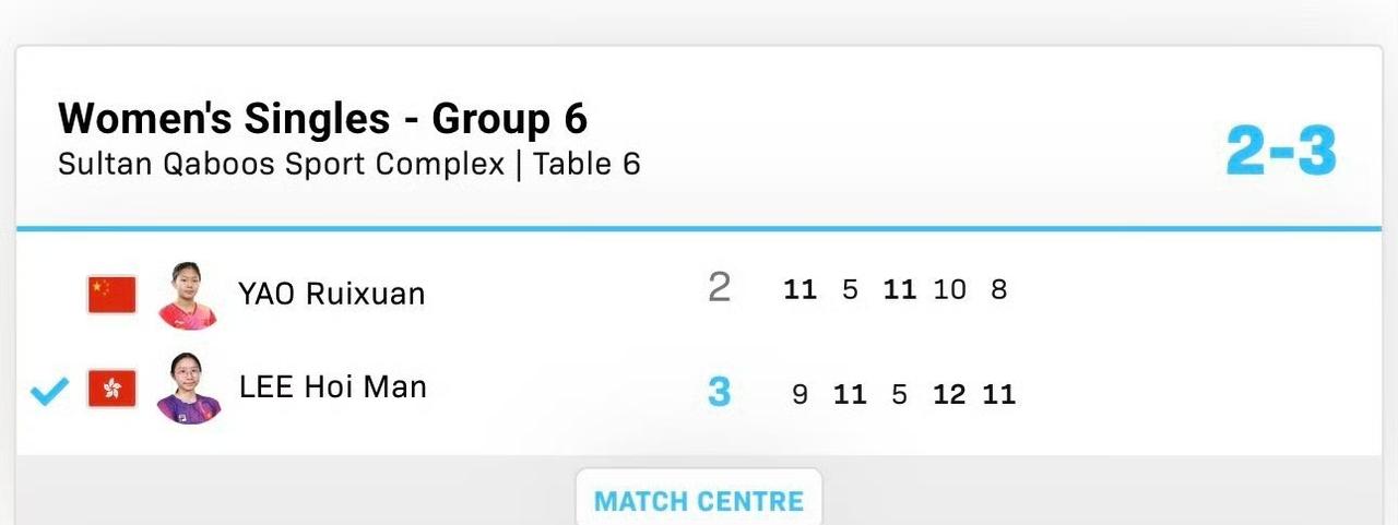 闫禹橦🇨🇳、姚睿轩🇨🇳首场失利! 刚刚结束的两场WTT常规挑战赛马斯喀特站女单资格赛小组循环赛上, 先丢一局、又追回一局的闫禹橦🇨🇳1-3最终不敌中立运动员泰拉科娃。 国乒另一位2009年出生的小将姚睿轩🇨🇳2-3不敌中国香港选手李凯敏🇭🇰,五局比分为:11-9,5-11,11-5,10-12,8-11。 2008年出生的闫禹橦(图一)是不可多得的左手执拍选手,但还是年轻,第一局用了暂停也没拿下,感觉就有点悬了,前面都在领先,感觉后面能追上,但还是未能如愿。 不过这是循环赛,还有一点儿晋级正赛的微弱希望。 姚睿轩(图二)输得更是可惜,决胜局7-4领先,还是丢了。 不过姚睿轩也还有机会,往下看吧。
