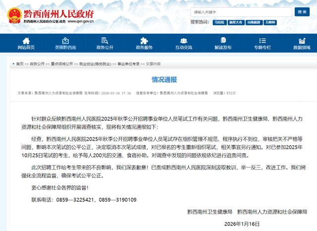 经查,黔西南州人民医院2025年秋季公开招聘事业单位人员笔试存在组织管理不规范、程序执行不到位、审核把关不严格等问题,影响本次笔试的公平公正,决定取消本次笔试成绩,对已报名的考生重新组织笔试,相关事宜另行通知。对已参加2025年10月25日笔试的考生,给予每人200元的交通、食宿补助。对调查中发现的问题依规依纪进行追责问责。