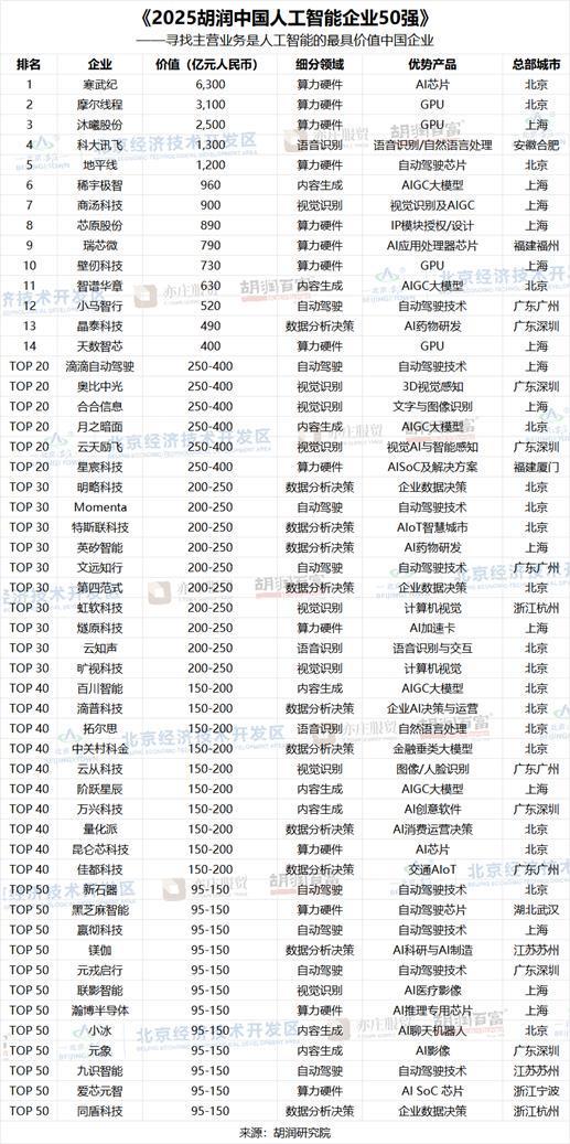 [环球网报道记者陈全]1月19日,胡润研究院在京发布《2025胡润中国人工智能企业50强》(2025HurunChinaArtificialIntelligenceEnterprisesTop50),榜单按照企业价值进行排名。上市公司市值按照2026年1月9日的收盘价计算,非上市公司估值参考同行业上市公司或者根据最新一轮融资情况进行估算。这是胡润研究院第二次发布该榜单。