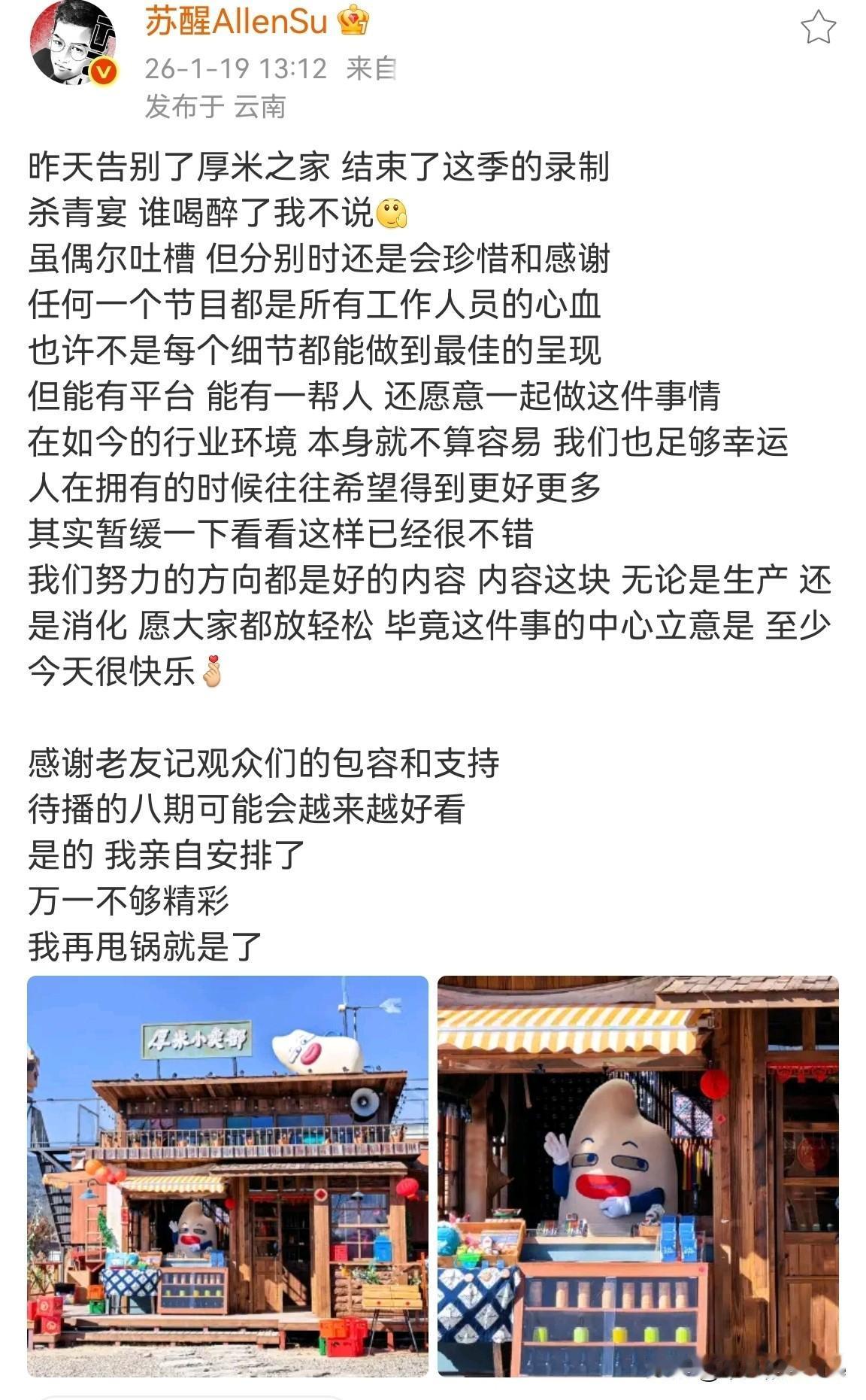 1月19日,苏醒发长文告别《快乐老友有风季》。醒哥还是一如既往地敢说,他还配了两张照片,分别是“厚米小卖部”和“厚米吉祥物”。 首先,醒哥表示自己偶尔也会吐槽节目组,但更多的是感谢和珍惜。 其次,醒哥提到《快乐老友记3》或许不能让每个人都满意,但大家确实都尽力了,毕竟现在做节目都不容易。 最后,他感谢观众们的支持和包容,并说后面八期可能会越来越好看,大家期待吗?