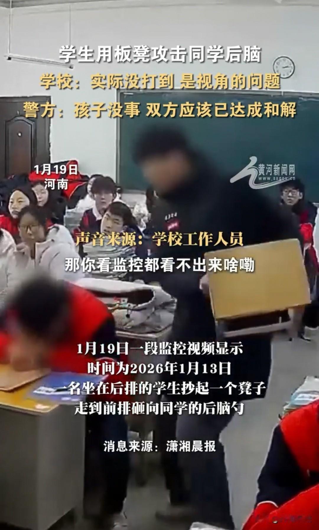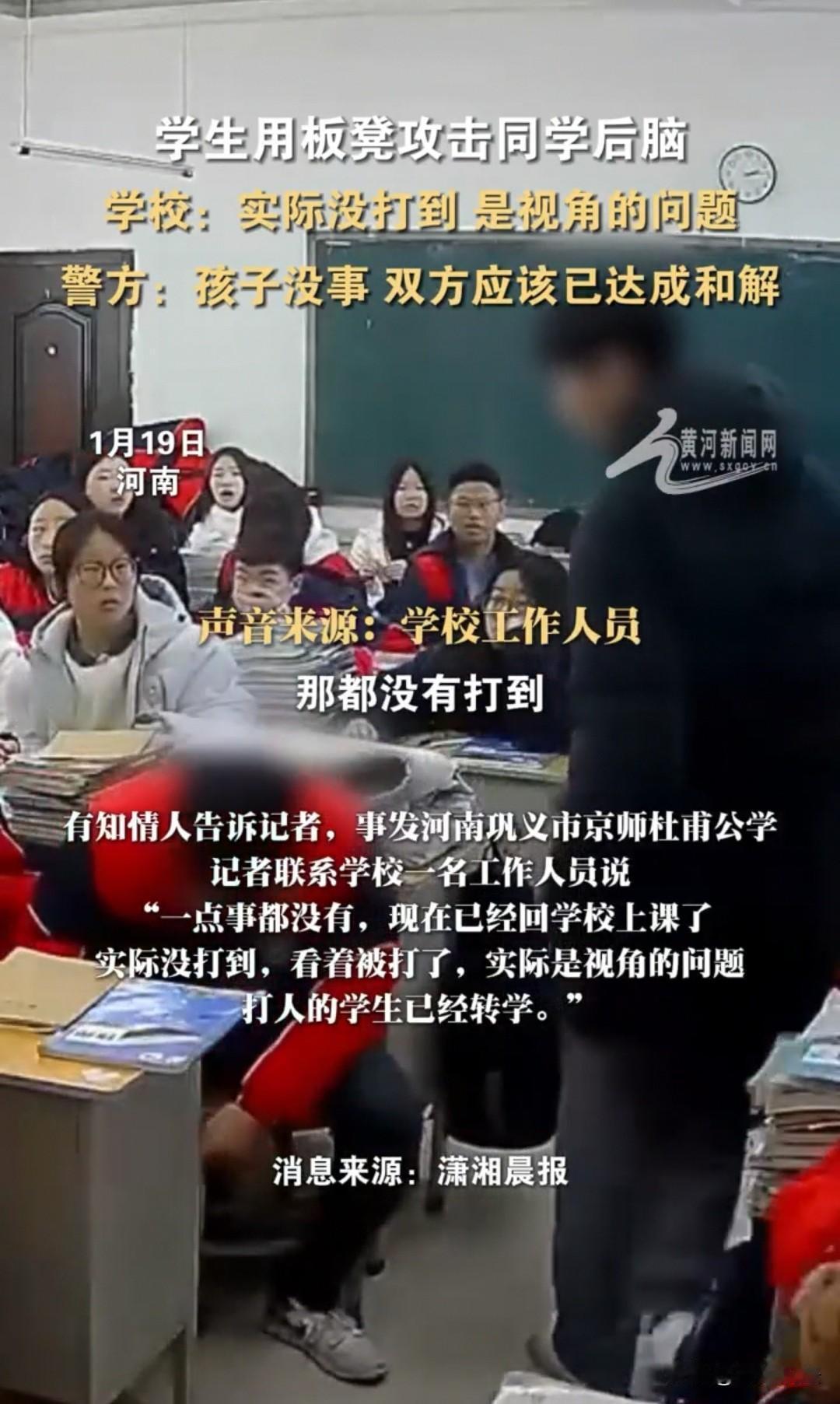 河南巩义,后排一个学生突然抄起凳子,朝着前排同学后脑勺就挥过去,好多人都担心是不是校园暴力,孩子有没有受伤,好在后续校方和警方的回应,把这事说清楚了。 1月13号,河南巩义市京师杜甫公学一段教室监控,在网上引起不少人关注,画面里那一幕看着挺揪心。 其实当天就是普通的上课日,教室里学生们都穿着统一校服,趴在堆满课本的课桌上听课,跟咱们平时见的课堂没啥两样。 谁也没料到,后排一个学生突然站了起来,随手就把自己坐的凳子拎了起来,径直朝着前排一个同学走过去。 走到人家身后,抬手就朝着同学后脑勺方向挥了一下,整套动作也就几秒钟,监控拍得明明白白。 这段视频一传到网上,很快就火了。 大家看着“拿凳子砸后脑”的画面,都挺着急的:前排那孩子是不是被打到了?有没有受伤?好好上课咋会出这事儿,是不是俩孩子之前有矛盾? 还有人忍不住问,课堂上老师没及时制止吗?学校管理是不是有点松?相关的讨论一下子就多了起来。 就在大家议论纷纷的时候,涉事学校的工作人员很快就出来回应了。 他们说,视频看着动作挺吓人,但实际上根本没打到人,主要是监控视角的问题。 工作人员解释,教室监控一般都装在角落或者后排,角度有限,拍出来的画面会有视觉误差。 从镜头里看,凳子都快碰到学生后脑了,可实际俩人间还有距离,全程没发生肢体接触,压根不存在打人这回事。 校方还说了俩孩子的情况:被挥凳的那个学生,身体一点事儿都没有,事发后就正常回教室上课了,学习生活啥也没耽误;而挥凳子的那个学生,现在已经转学了,去别的学校读书了。 之后辖区派出所也核实了情况,工作人员说,他们专门问了学校,也跟两边家长沟通过了。 现在俩孩子的家长已经私下和解了,没再因为这事起纠纷,而且两个孩子确实都没受伤,当时就是动作幅度大,看着唬人,才让大家这么担心。 其实这种因为监控视角闹误会的事儿,咱们平时也见过不少。 教室就那么大,监控角度又固定,有时候拍出来的画面跟实际情况确实不一样。 就像这次,明明没碰到,可镜头里看着就跟要打上了似的,也难怪大家会先入为主担心。 不过话说回来,学校这次回应挺及时的,一下子就把误会澄清了,也让关心孩子的人放了心。 两边家长也挺通情达理,没把事情闹大,达成和解是最好的结果。 至于挥凳的学生转学,既能维护校园秩序,也能让这孩子换个新环境,避免之后跟同学再产生摩擦,也算是个稳妥的处理方式。 这事能火,说白了就是咱们都操心孩子在学校的安全,盼着娃能好好长大。 咱们都知道,孩子在学校难免会有小摩擦,未成年人遇事容易冲动,做出不理智的动作也能理解。 但更重要的是,学校得平时多引导,教孩子遇到矛盾好好说,别动不动就用过激方式解决。 而且遇到这种突发情况,除了澄清事实,要是能说说俩孩子为啥会起冲突、之后有没有做引导教育,大家可能会更安心。 现在这场小风波也平息得差不多了,俩孩子都回到了正常的学习生活里,网上的讨论也慢慢少了。 其实不管是学校、家长,还是咱们这些旁观者,最希望的不就是孩子们能在校园里平平安安的嘛? 同学之间有小矛盾好好说,遇事别冲动,这才是校园该有的模样,你们说对不对? 其实这事看着是误会,但背后法律门道挺明确的。 先说说那挥凳子的学生,虽然没打到人,但这危险动作真要造成伤害,责任可不小。 根据《民法典》第一千一百八十八条,未成年人犯错造成他人损害,得由家长承担赔偿责任,毕竟家长有监护义务。 而且要是情节重点,比如真伤了人,就算是未成年人,也可能按相关规定担责,年龄可不是“免罚金牌”。 再看学校的责任,《民法典》第一千二百条说得明白,限制民事行为能力人在学校受损害,学校没尽到教育管理职责,就得担责。 这次虽说是视角误会,但课堂上出现这种过激动作,要是老师没及时制止,学校其实没完全尽到义务。 不过好在学校后续回应及时,还协调双方和解,这步符合《学生伤害事故处理办法》里的要求,处理得挺稳妥。 还有大家关心的监控,教室装监控没问题,但得合规,不能随便拍了就乱传,不然可能侵犯学生隐私权。这次监控刚好还原了事实,也算起到了该有的作用。 总的来说,这事没造成伤害是万幸,但也提醒咱们,不管是家长还是学校,都得让孩子知道,遇事冲动耍性子可能要担法律责任,学校也得把管理做到位,这样才能护着孩子们平安成长。 对于此事,大家如何看? 素材来源于九派新闻