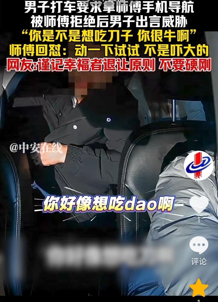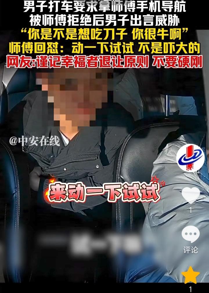 “太嚣张了”!广东,男子带着女伴一块打车,坐上车后男子想用司机手机导航,司机拒绝了男子,并称车上有导航,男子听到司机拒绝了自己,竟然直接出言威胁司机“你是不是想吃刀子,你很牛啊!”,司机也是丝毫没有胆怯,回怼男子“动一下试试,我不是吓大的”,这时男子一块的女伴就连忙劝阻了男子。 司机不让男子用自己手机导航也是正常,毕竟是陌生人有所防备也是理所当然,更何况司机车上有导航,根本就可以不用手机导航,没想到的是男子竟然因此就直接出言威胁司机,现在是法治社会,男子这种行为也是太过嚣张了,有视频为证,司机完全可以选择报警,千万不能惯着男子这种人。 和男子一块的女伴,如果是男子女朋友,那么就应该尽快分了,因为从男子言语就可以看出,他是一个很危险而且容易冲动的人,所以为了自己的未来着想,还是分了的好。 从一个人言行举止就可以看出他的品行,像男子这样嚣张的人,希望他能得到严惩。