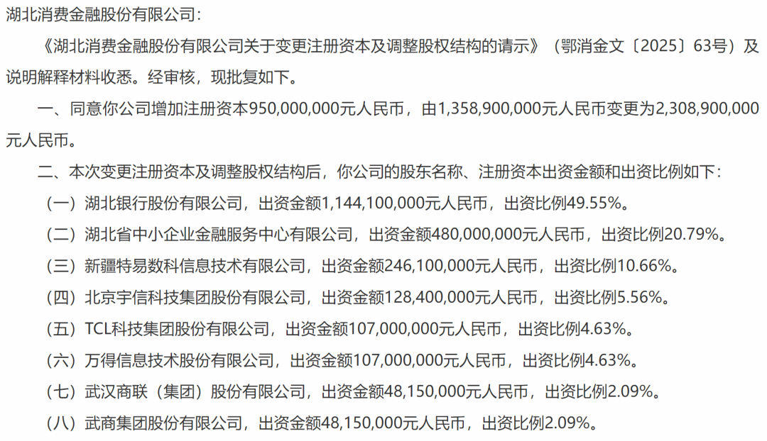 日前,国家金融监督管理总局官网显示,湖北监管局同意湖北消费金融股份有限公司增加注册资本增加9.5亿元,由13.589亿元变更为23.089亿元人民币。
