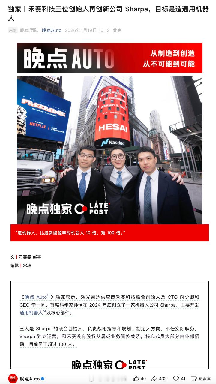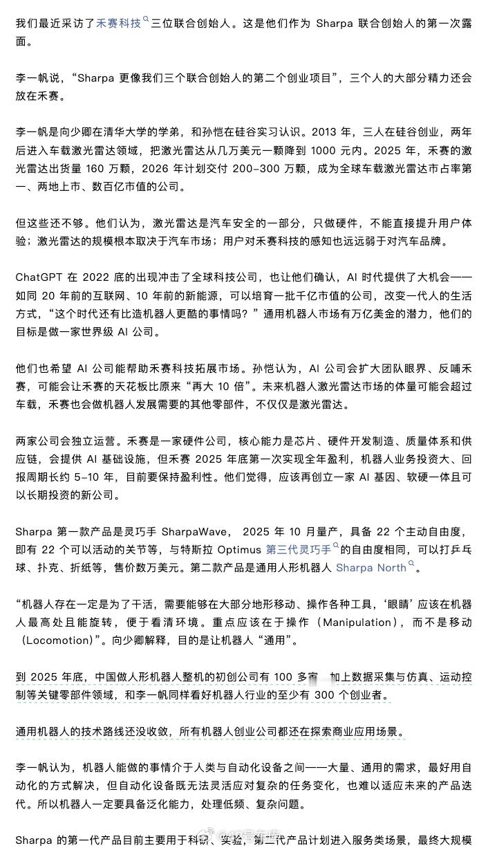 《晚点 Auto》的消息,禾赛科技联合创始人及 CTO 向少卿和 CEO 李一帆、首席科学家孙恺在 2024 年底创立了一家机器人公司 Sharpa,主要开发通用机器人及核心部件。三人是 Sharpa 的联合创始人,负责战略指导和规划、制定大方向,不任实际职务。Sharpa 独立运营,和禾赛没有股权从属或业务管控关系,核心成员大部分由外部招聘,目前员工超过 100 人。李一帆对 Sharpa 的定位是「我们三个联合创始人的第二个创业项目」,三个人大部分精力还是会放在禾赛。他们的目标是做一家世界级 AI 公司,也希望 AI 公司能帮助禾赛科技拓展市场。Sharpa 第一款产品是灵巧手 SharpaWave, 2025 年 10 月量产,具备 22 个主动自由度,即有 22 个可以活动的关节等,与特斯拉 Optimus 第三代灵巧手的自由度相同,可以打乒乓球、扑克、折纸等,售价数万美元。第二款产品是通用人形机器人 Sharpa North。大家看好禾赛做人形机器人吗?42how新能源汽车