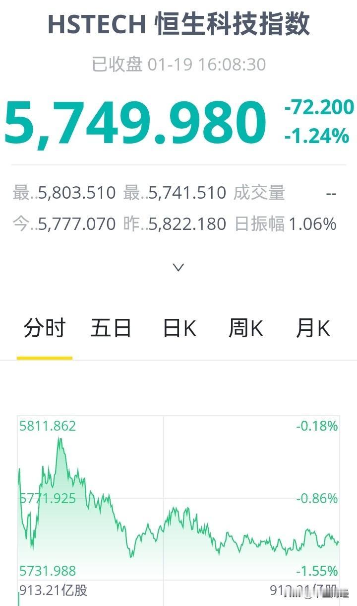 2026年1月19日,港股市场表现疲软,恒生指数下跌1.05%,收于26563.9点;恒生科技指数跌幅更大,达1.24%,收于5749.98点。科技股普遍承压,拖累指数下行。市场情绪受宏观经济不确定性影响,投资者观望情绪浓厚。南向资金逆势净买入,显示部分资金逢低布局。