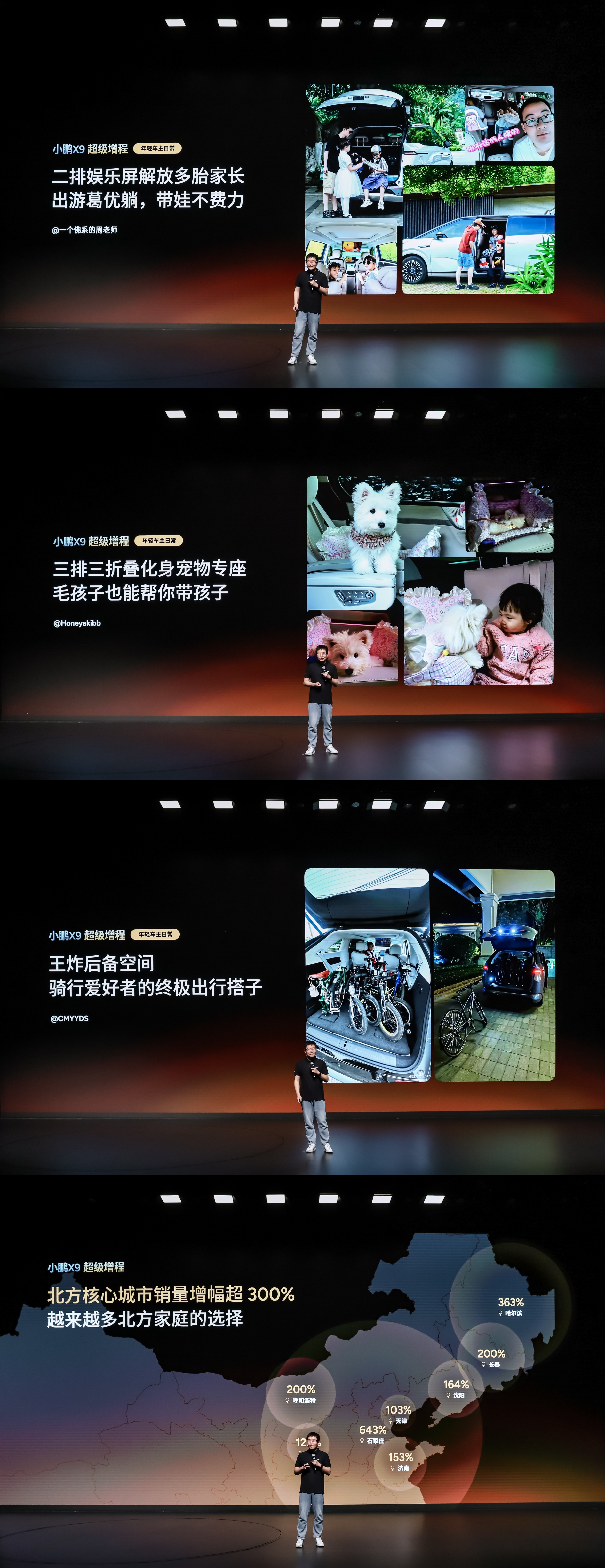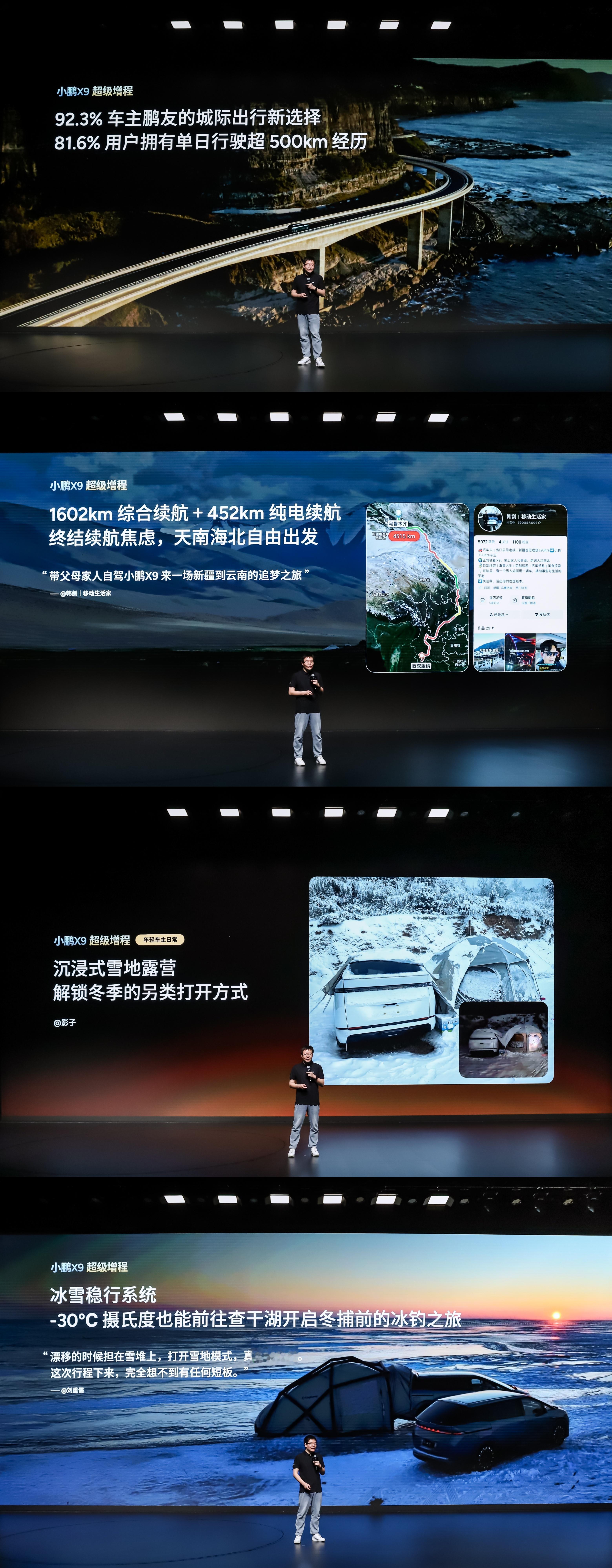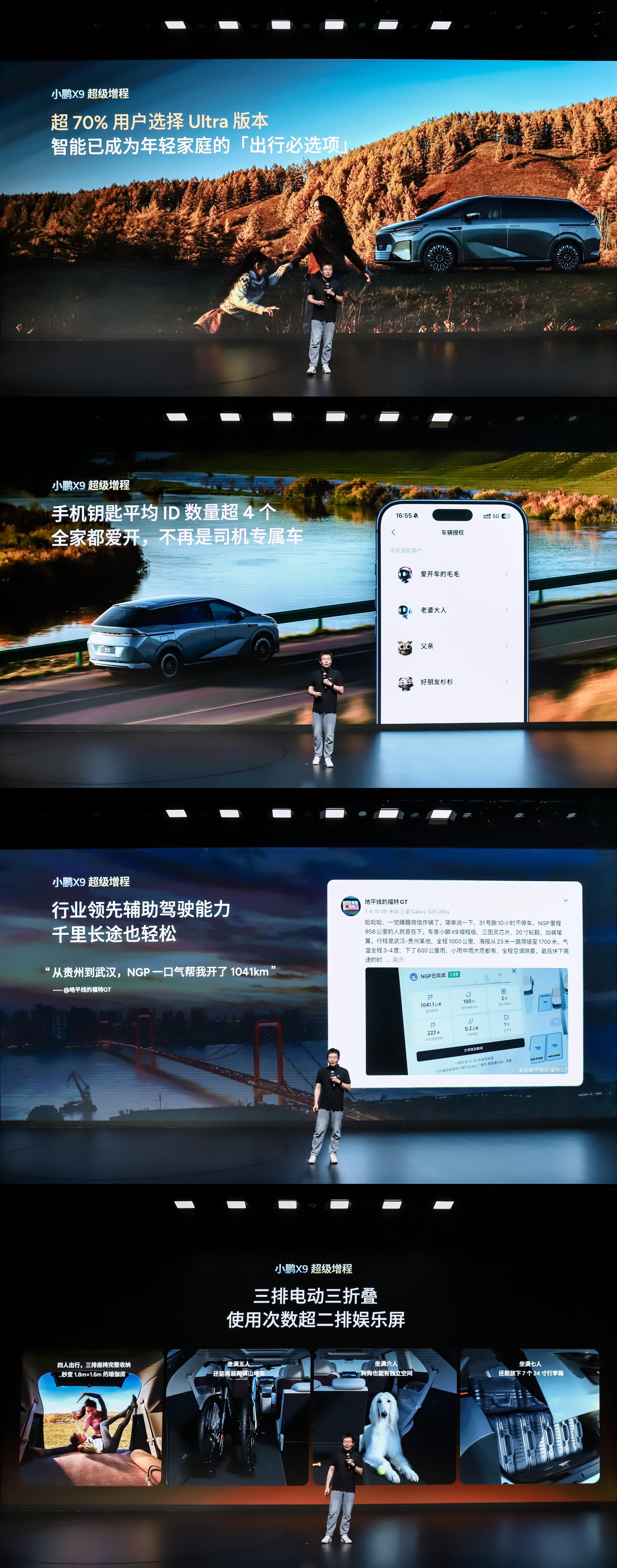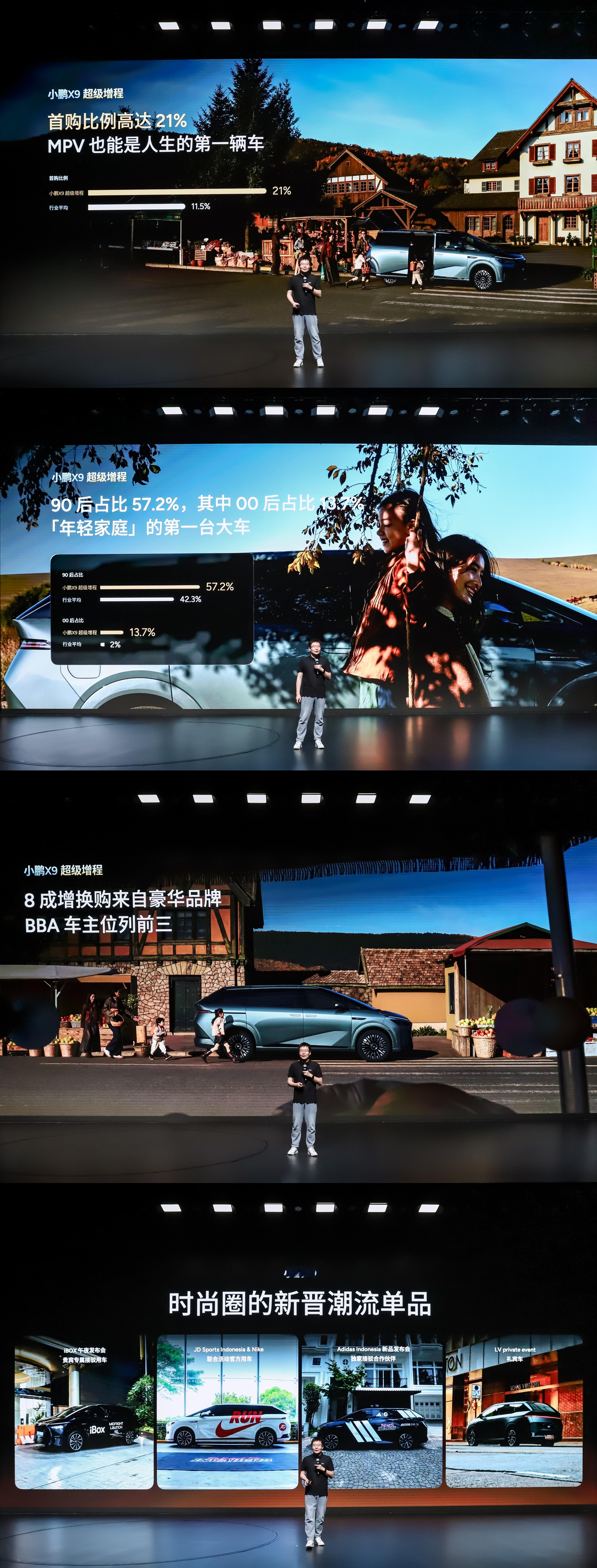 去年我在海南试驾小鹏X9超级增程版的时候我就说这车肯定会大卖,而且凭借个性时尚的星舰造型会吸引到很多年轻用户,果然,我说对了,2025年12月X9交付5,424台,刷新了单月历史交付纪录。今天小鹏公布了X9超级增程的首个用户画像报告,90后占比高达57.2%,00后占比13.7%,个人用户交付量占比近八成,8成增换购来自豪华品牌BBA车主位列前三,可以说X9的用户群和传统MPV用户群完全不一样。很多时尚活动都选择X9作为接驳车,很多明星艺人都选择X9作为保姆车。小鹏X9卖得好很正常,产品力确实强,很多数据都让我印象深刻,比如5.4米的转弯半径,1602km的综合续航+452km的纯电续航,10分钟即可补能313km,还能加92号油,魔术空间、三排电动三折叠也非常吸引人,我觉得X9接下来销量会更高更火爆。小鹏X9年轻家庭的第一台MPV小鹏X9超级增程首个用户画像报告发布