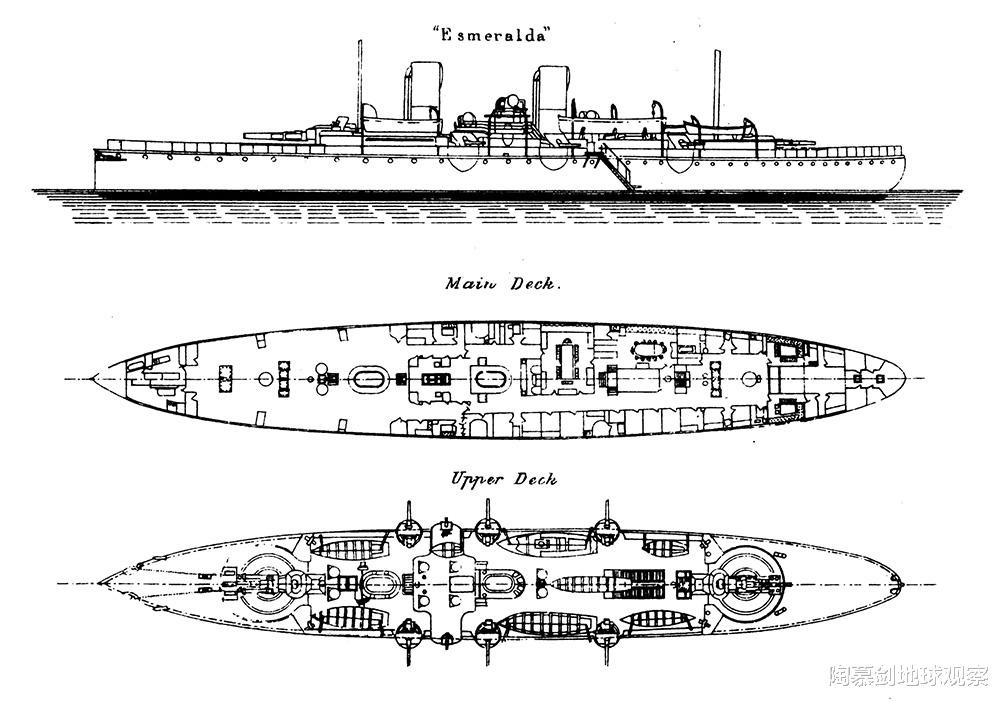 “浪速”型有一个关键特点,主炮也是260毫米/L35克虏伯炮,副炮也是150毫米/L35克虏伯炮,与我们理想中的定远、镇远是相同配置。换言之,致远、靖远、经远、来远四舰都换成“浪速”型设计,意味着什么结果呢?(再进一步架空,济远号建造时换成英国建议的“埃斯梅拉达”号设计,2900吨排水量,2门254毫米主炮和6门152毫米副炮,英制火炮也换成德制克虏伯炮)