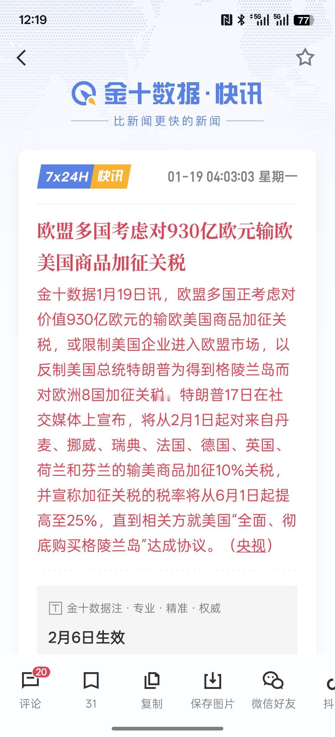欧洲与美国两国之间相互要增加关税,现在欧洲股市大幅低开,估计今晚美股也是一个低开的走势!那因为格陵兰岛的问题,双方之间已经发生了矛盾!欧洲与美国之间又多了一道裂痕! 其实,关于美国一直都是要拿盟友开刀!现在特朗普时期就是在盟友背后捅刀子!就连加拿大是美国的邻国,尤其是西半球,基本上美国是不会放过的!现在美国要对欧洲开始动手,就看欧洲能不能hold住!